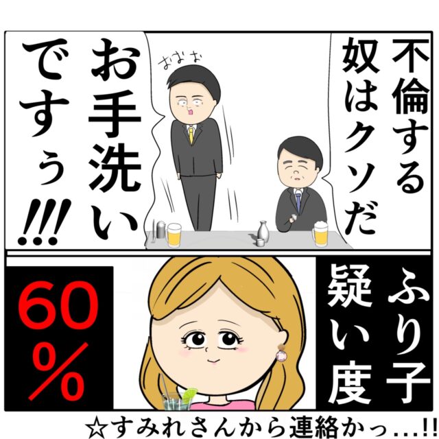 社内に不倫している人がいると聞いた部長は「不倫する奴はクソだ」とご立腹。すかさずお手洗いに行くと言って慌てて席を立った良し男さんを見て、ふり子さんの疑い度は60%にアップしました。