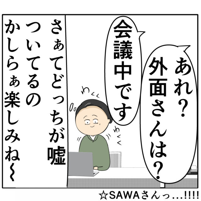 その頃オフィスでは、「あれ?外面さんは?」「会議中です」そんなやり取りの声を聞きながら仕事をするサワさんが「さぁて、どっちが嘘ついてるのかしらぁ。楽しみね~」とほくそ笑んでいました。