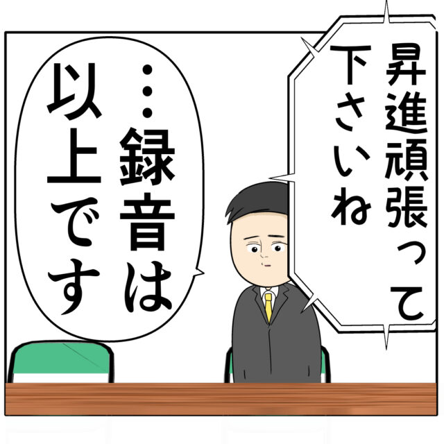 「昇進頑張って下さいね」と、ボイスレコーダーには先日の会社の飲み会後にふり子さんが良し男さんを呼び出した時の2人の会話が録音されていました。「・・・録音は以上です」良し男さんは静かに言いました。