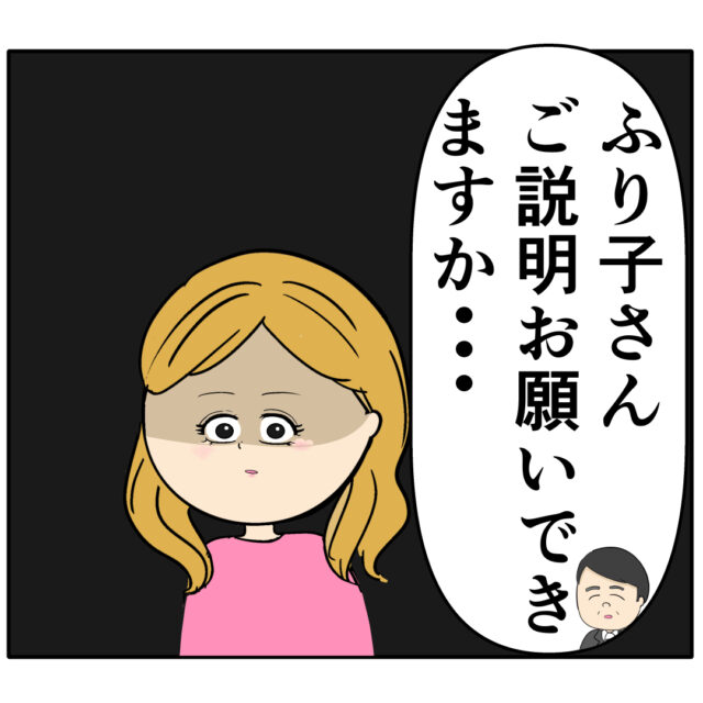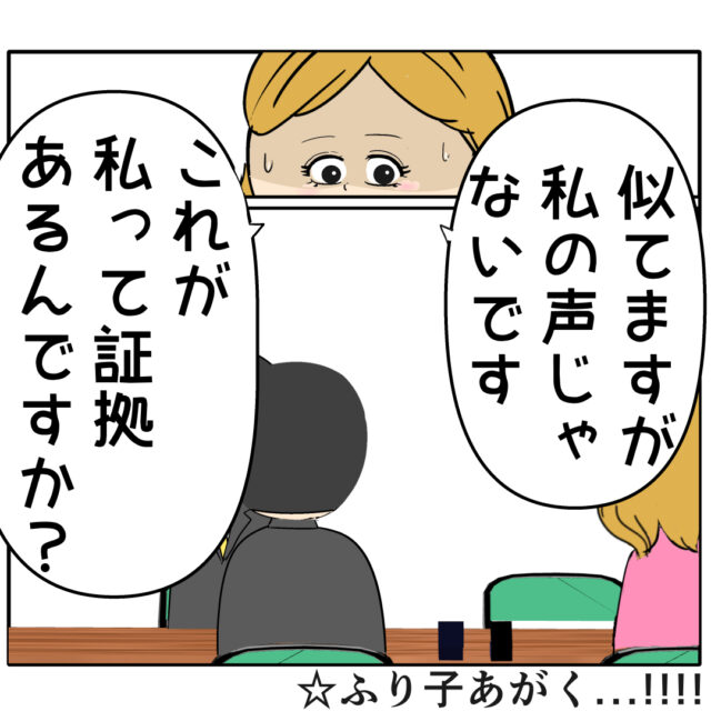 想定外の証拠を出され窮地に立たされたふり子さん。説明を求められ「似てますが私の声じゃないです。これが私って証拠あるんですか?」とあがきます。