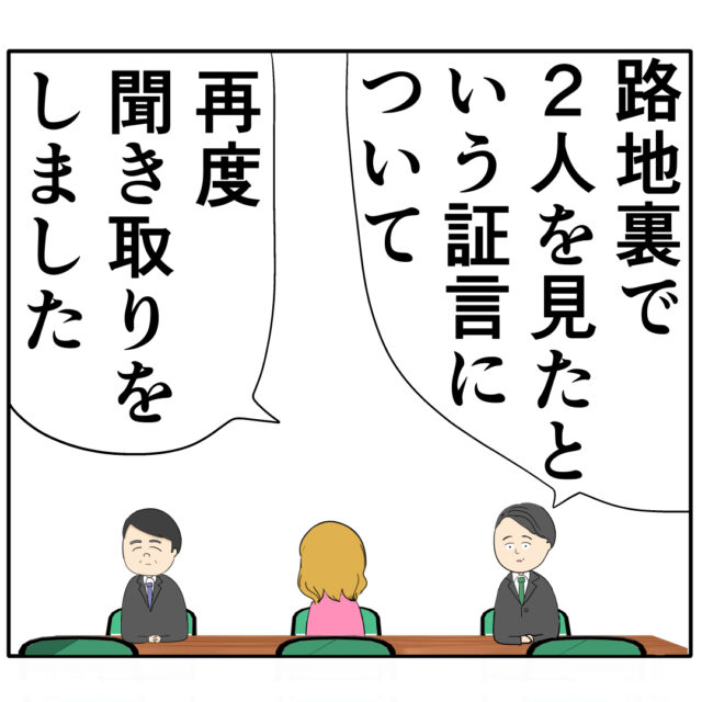 まずは課長が背苦腹さんの証言の聞き取り結果を伝えます。「路地裏で2人を見たという証言について再度聞き取りをしました」