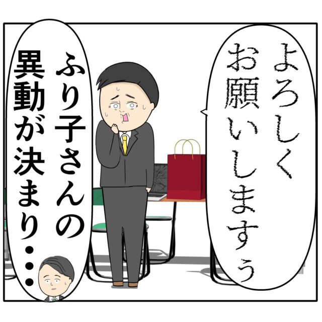 「よろしくお願いしますぅ」ふり子さんが何をしでかすか不安で震える良し男さんに、「ふり子さんの異動が決まり・・」課長が話を続けます。