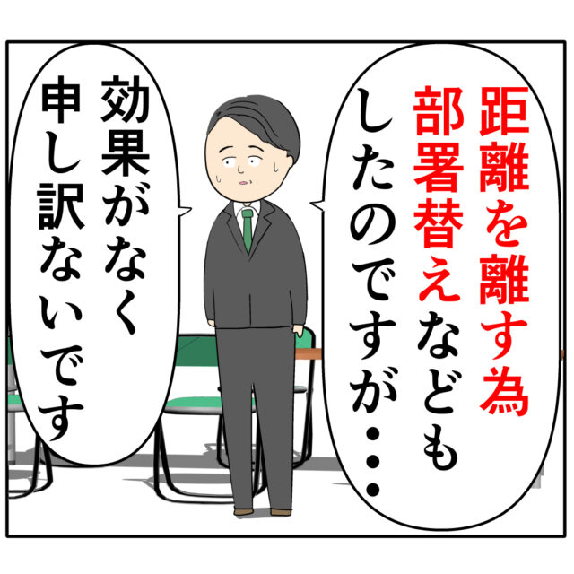 「距離を離す為部署替えなどもしたのですが・・効果がなく申し訳ないです」と謝りました。