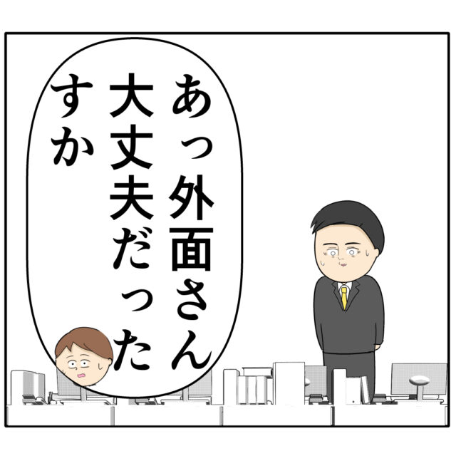 そして部署に戻った良し男さんに、「あっ、外面さん大丈夫だったすか?」村上さんが声をかけました。