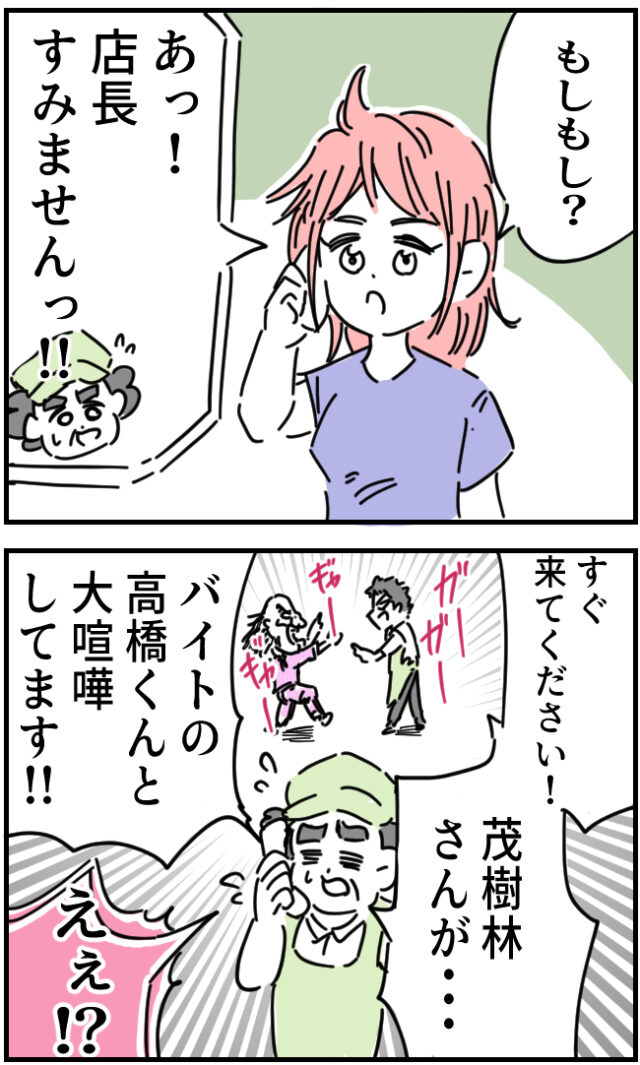 「すぐ・・来てください!茂樹林さんが・・バイトの高橋くんと・・大喧嘩してます!!」