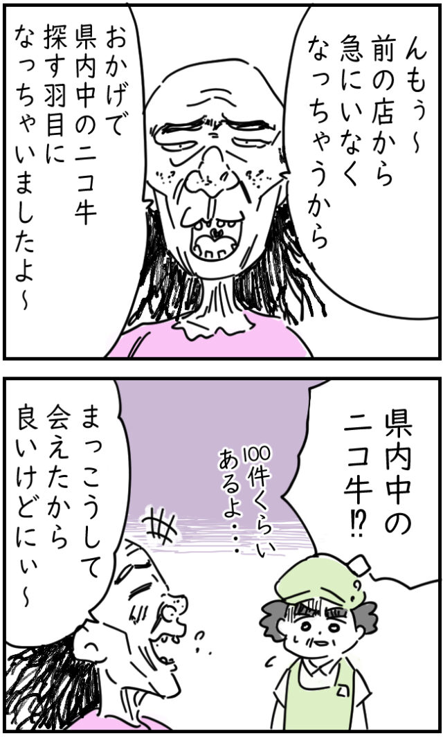 「んもぅ~、前の店から急にいなくなっちゃうから~!おかげで県内中の『ニコ牛』を探す羽目になっちゃいましたよ~」