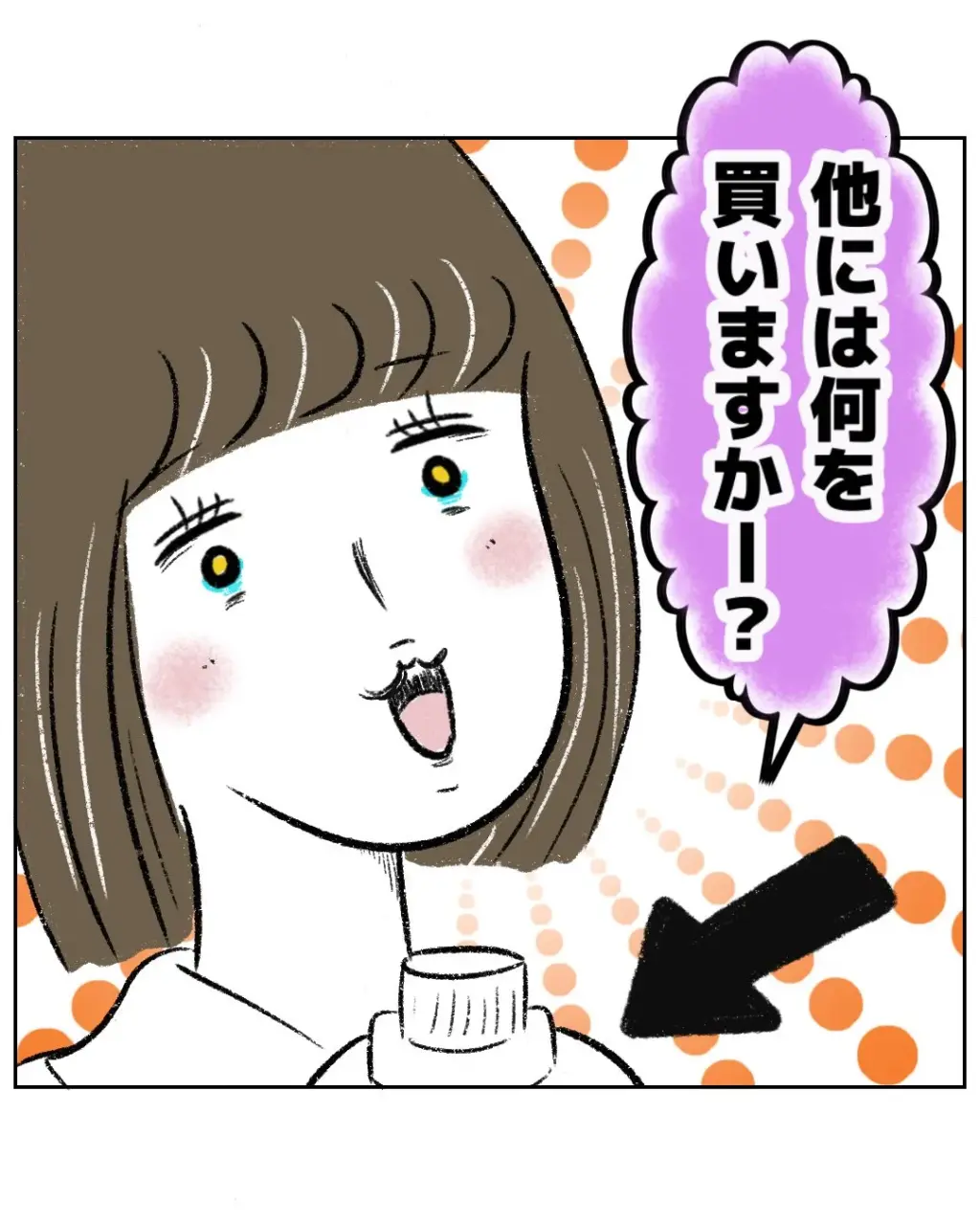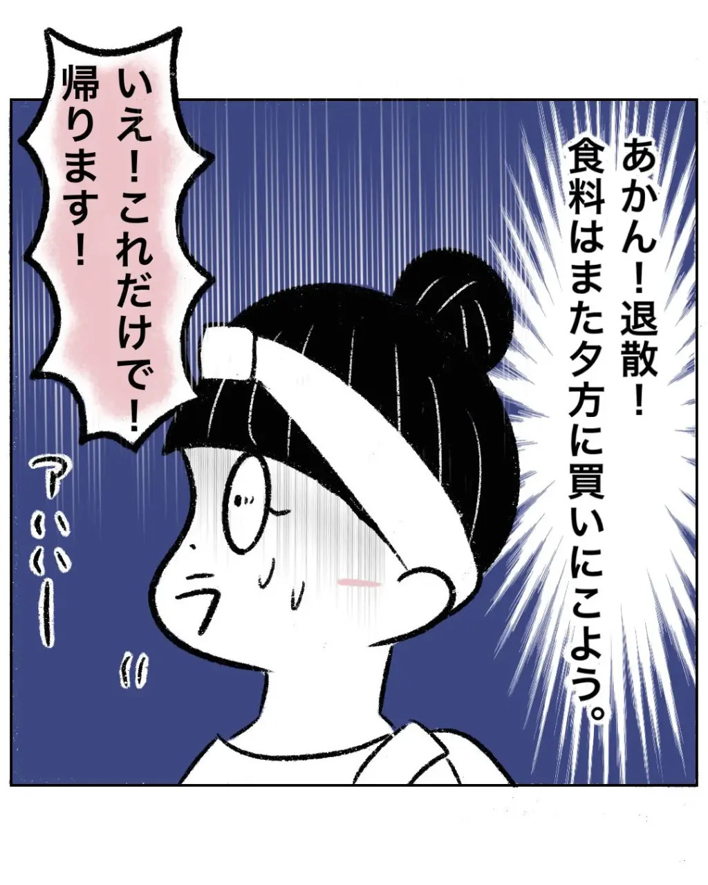 自分が買うものを全部真似してきそうなゆかちゃんママの勢いにドン引きのまるさんは「あかん!退散!食料はまた夕方に買いにこよう」と考え、「いえ!これだけで!帰ります!」と引きつった笑顔でゆかちゃんママに伝えると、