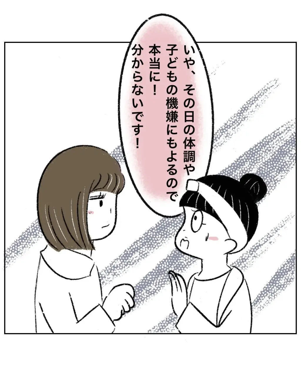 ゆかちゃんママの勢いに圧倒されながらも「いや、その日の体調や子どもの機嫌にもよるので本当に!分からないです!」とちょっと強めにはっきりと「分からない」と答えました。
