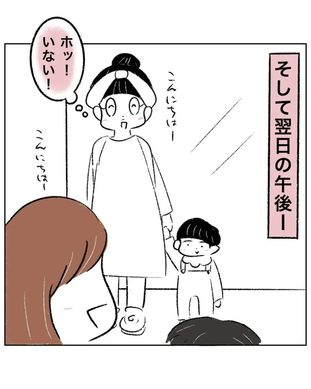 そして翌日の午後。まるさんがアキくんを連れて児童館へ行くと予想通りゆかちゃんママの姿はなく、ホッとするまるさん。