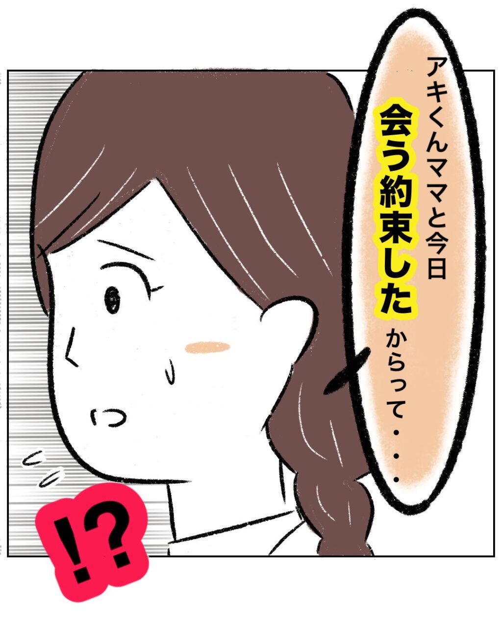 続けて先生が「アキくんママと今日会う約束したからって・・」と話すので、まるさんは「!?」と驚きます。