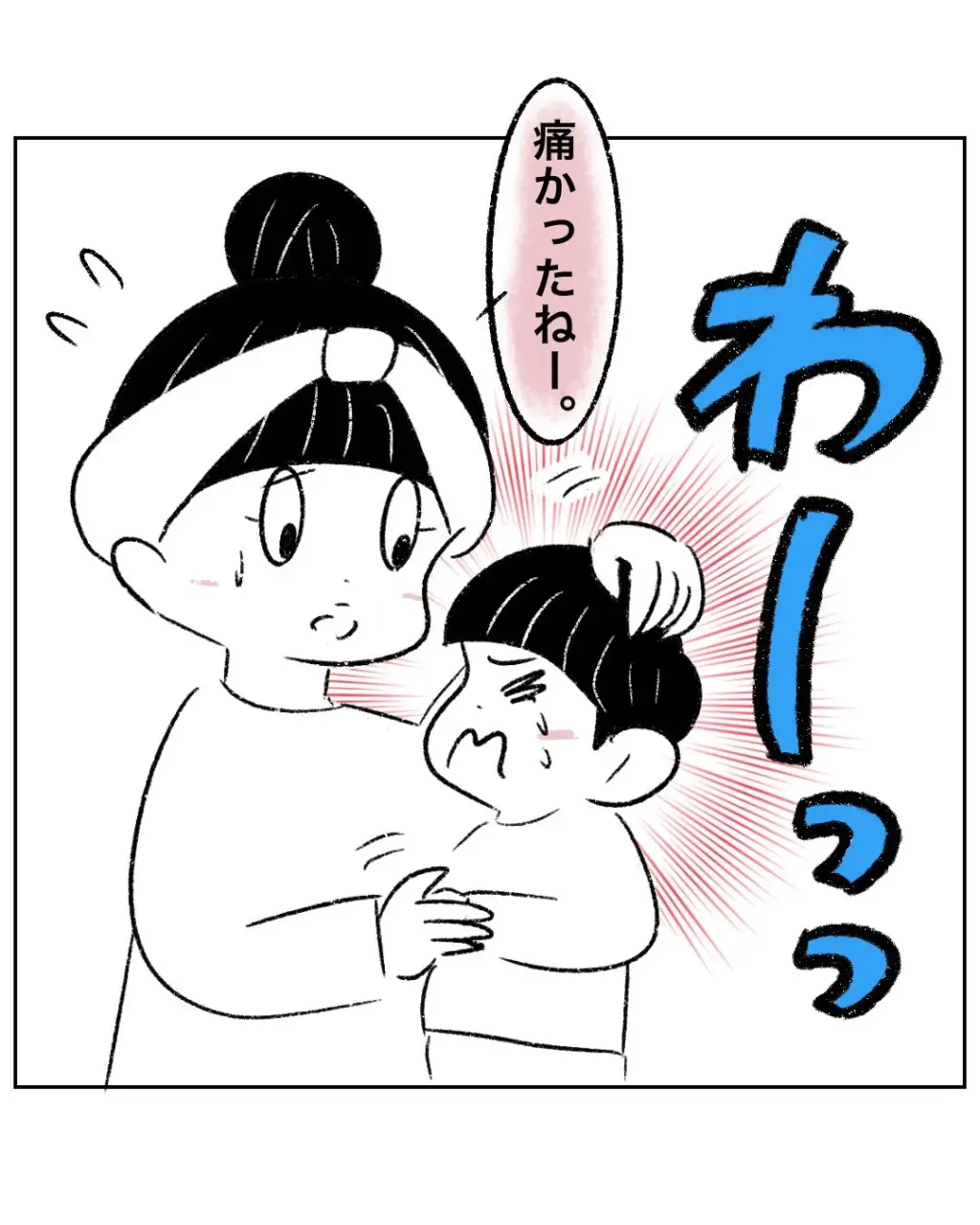 痛みと驚きでアキくんは大泣き。まるさんは慌てて「痛かったねー」とアキくんに声をかけましたが、