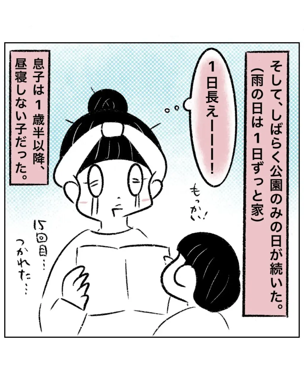 そして、行ける児童館がなくなったまるさん達はしばらく公園のみの日が続きました。雨の日は公園にも行けないので一日ずっと家でアキくんと二人で過ごすことになり、一日がとても長く感じました。アキくんは1歳半以降お昼寝をしない子だったこともあり、家でずっと過ごすことが続くとまるさんはどんどん辛くなっていきました。