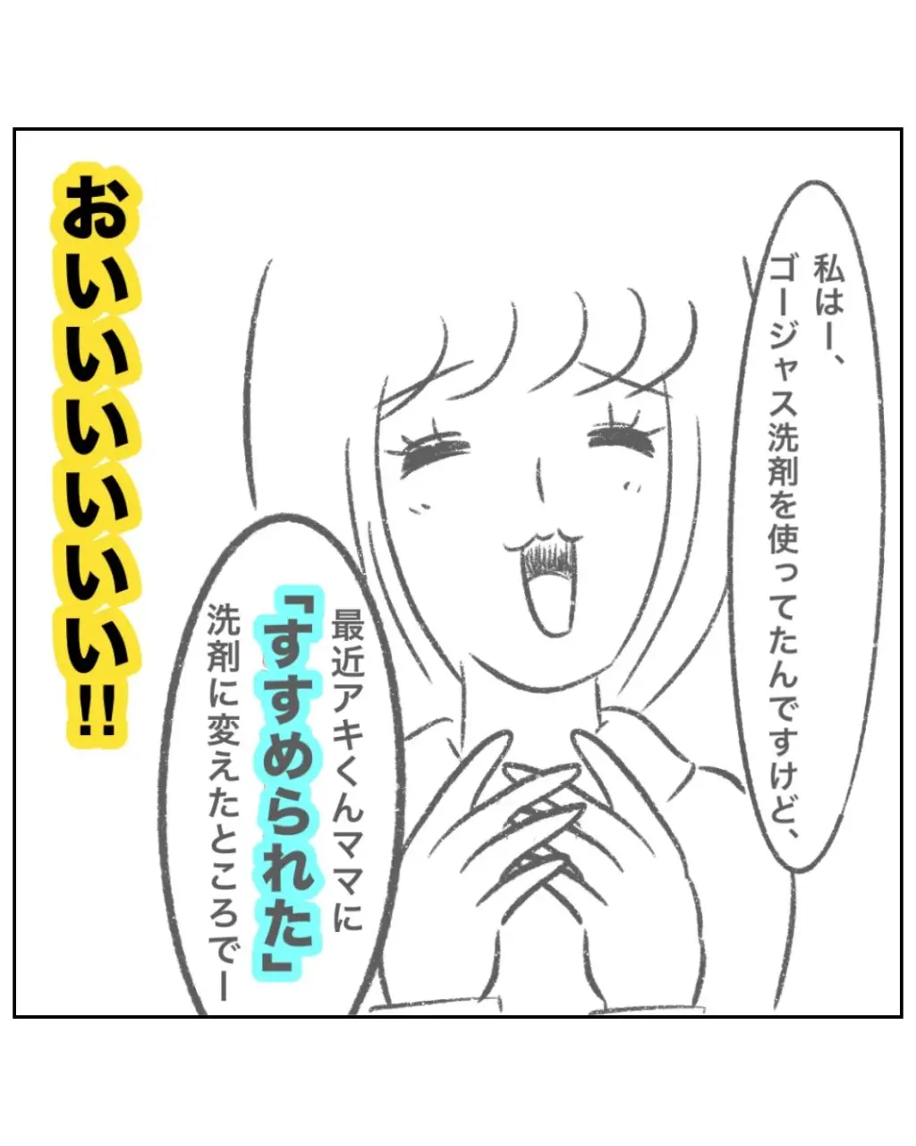 ゆかちゃんママが「アキくんママにすすめられた洗剤に変えた」と、さも仲が良いかのように周りに話していたと聞き「おいぃぃぃぃぃ!!」と心の中で激しく突っ込むまるさん。