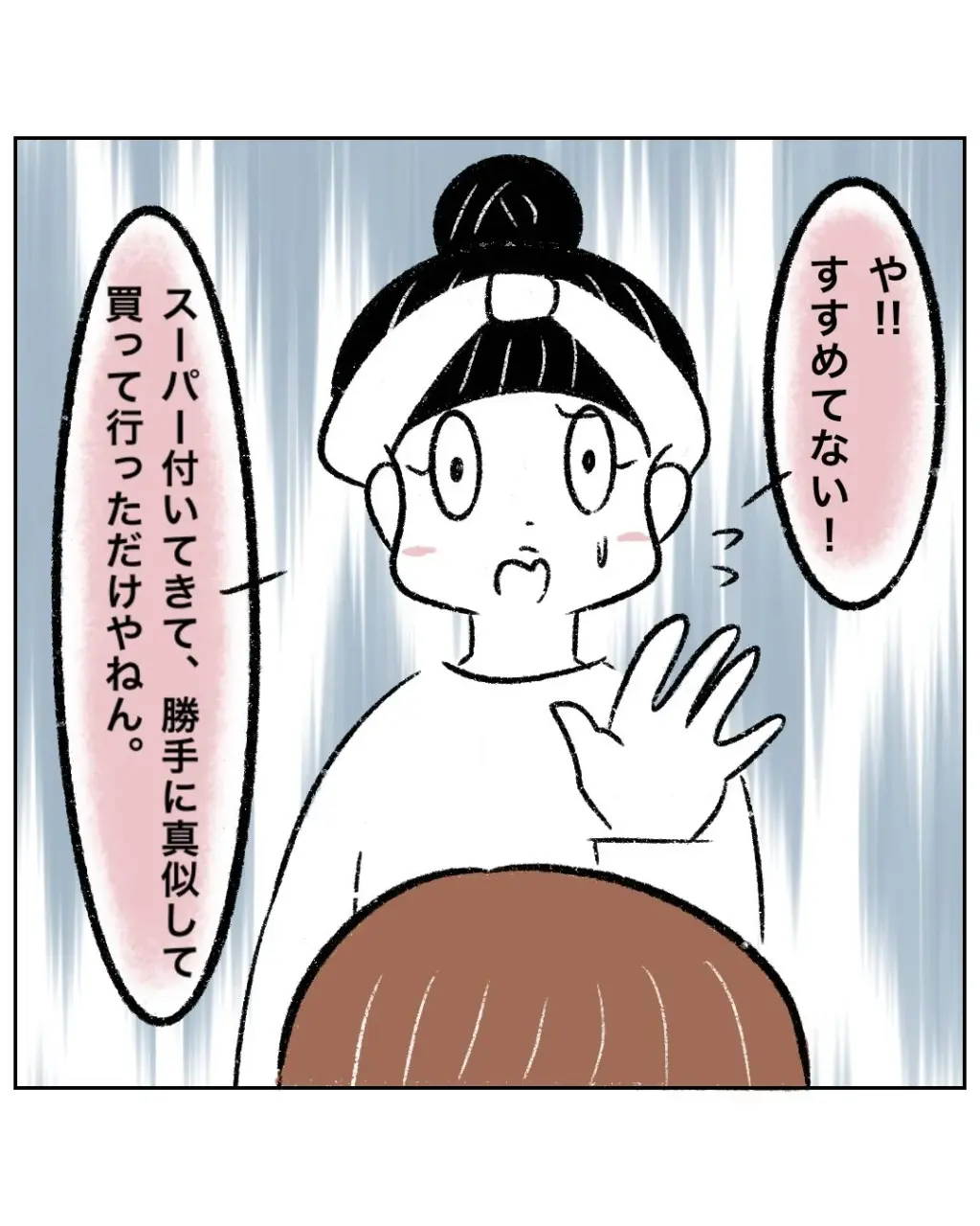 まるさんはすぐに「や!!すすめてない!スーパーついてきて、勝手に真似して買っていっただけやねん」とゆかちゃんママが話していたことをきっぱり否定し、ゆかちゃんママが同じ洗剤を買った時のことを説明しました。