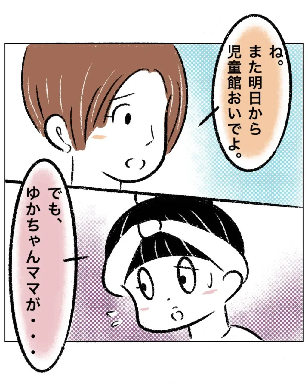 マキちゃんママは「ね。また明日から児童館おいでよ」とまるさんを誘いましたが、「でも、ゆかちゃんママが・・」とゆかちゃんママに会いたくないまるさんは行きたくても「うん」と言えません。