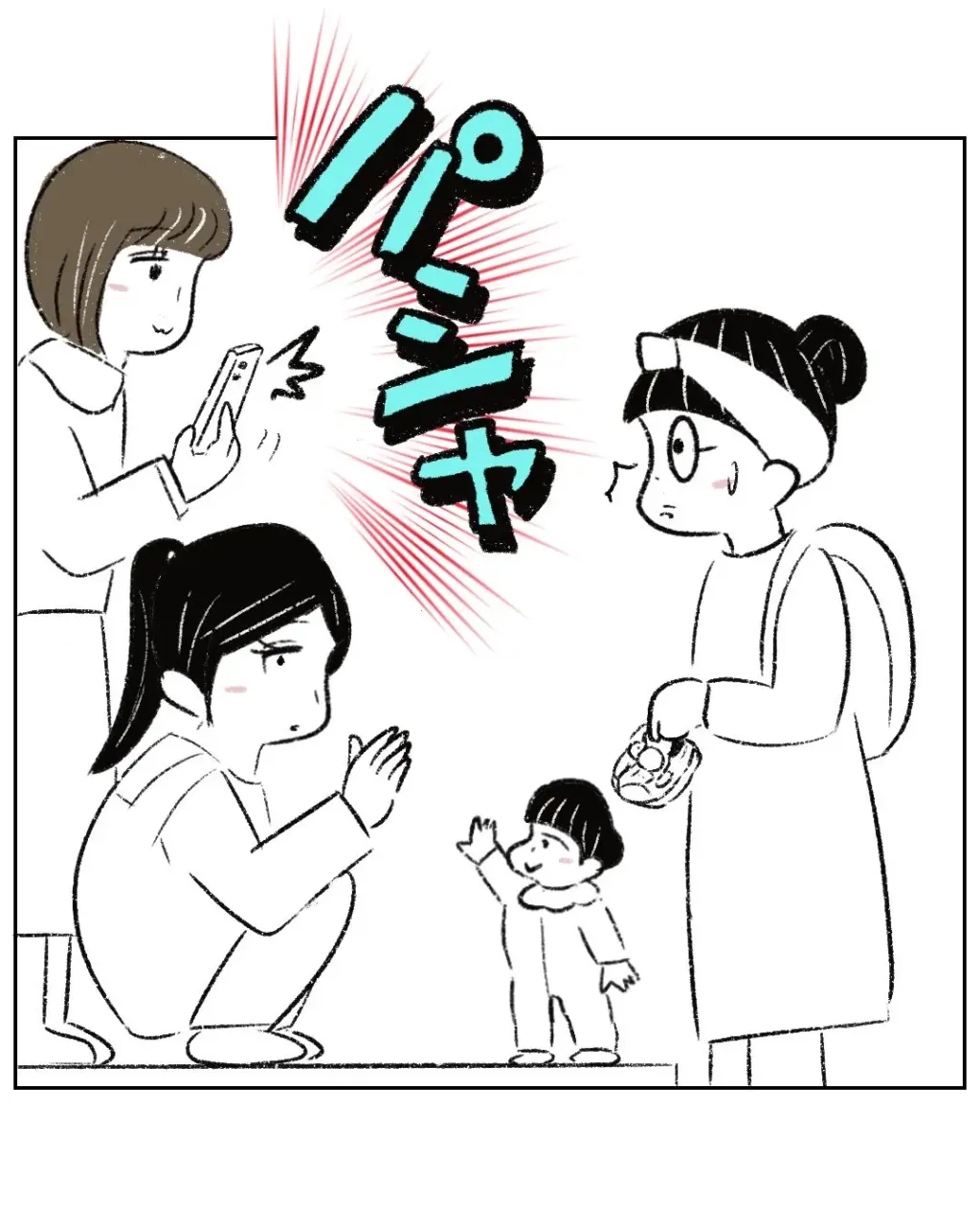 すると、突然ゆかちゃんママがアキくんの靴にスマホを向け、まるさんに何の断りもなくパシャッと写真を撮りました。どう考えてもアキくんも写り込んだはずです。まるさんは絶句しています。