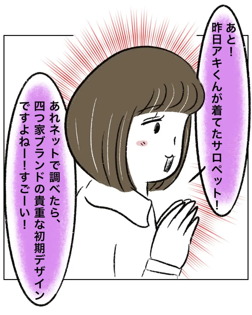 しかし、ゆかちゃんママはまるさんが引いていることに気づきもせず「あと!昨日アキくんが着てたサロペット!あれネットで調べたら、四つ家ブランドの貴重な初期デザインですよねー!すごーい!」と嬉しそうに話し続けます。
