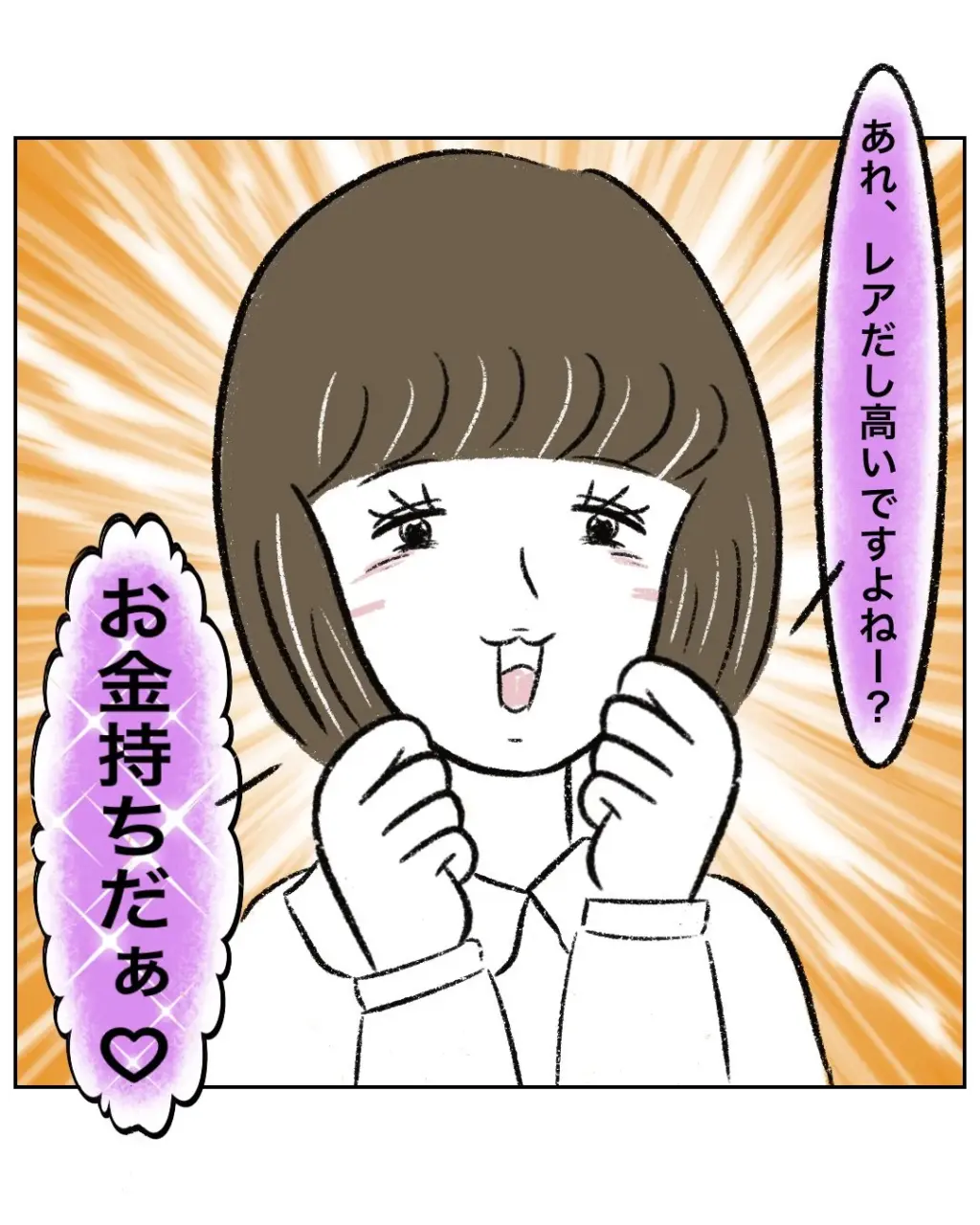 ゆかちゃんママは嬉しそうに話し続けます。「あれ、レアだし高いですよねー?お金持ちだぁ!」