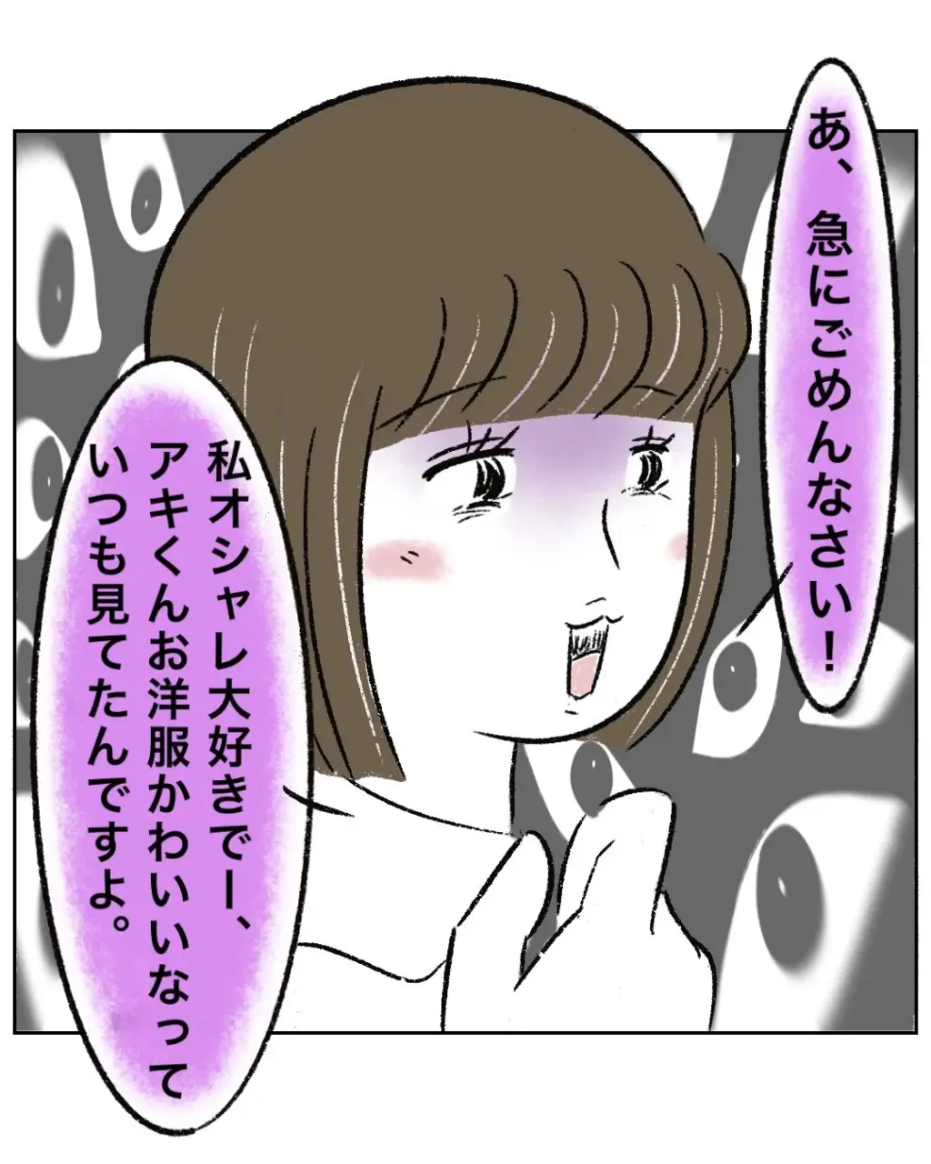 すると、「あ、急にごめんなさい!私オシャレ大好きでー、アキくんお洋服かわいいなっていつも見てたんですよ」と言い出すゆかちゃんママ。