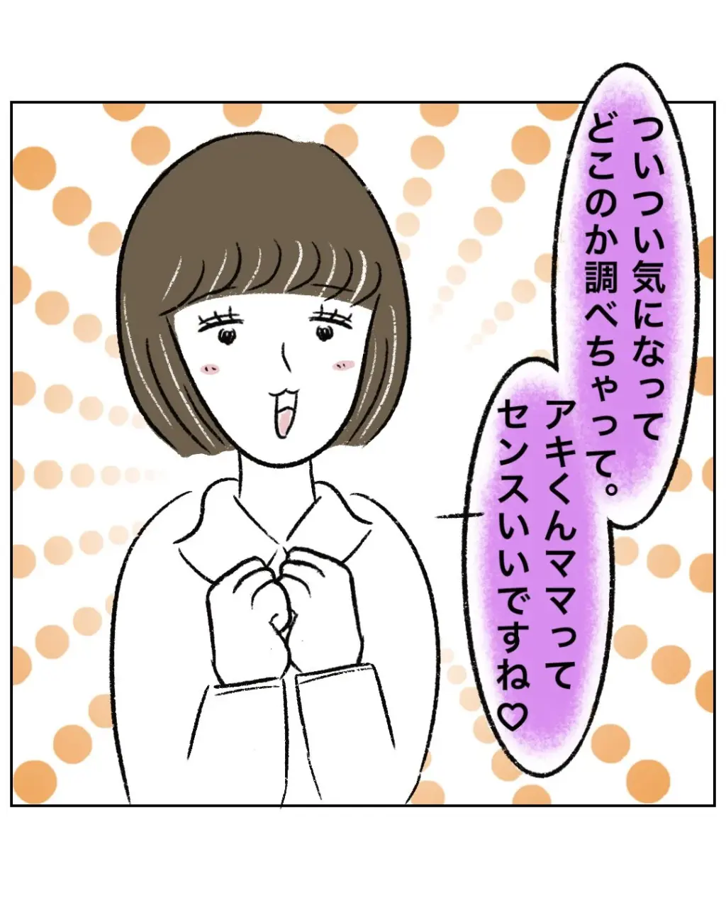 「ついつい気になって、どこのか調べちゃって。アキくんママってセンスいいですね」ゆかちゃんママに褒められたまるさんは、
