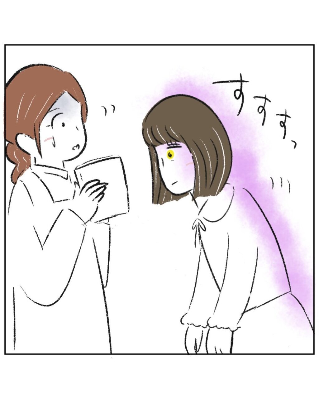 「『いらない』から持って来たなら、私がもらっても問題ない」と言い切るゆかちゃんママの発言に硬直するまるさんとマキちゃんママ。笑顔で「ください」と手を出すゆかちゃんママに恐怖を覚えました。すると、児童館の先生に近づいて「・・さ」と笑顔で手を出すゆかちゃんママに、驚いたあまり、言われるまま絵本を差し出す先生。るんるんしているゆかちゃんママを見て、「マジか、この人っっ!!」と心の中で叫ぶまるさんに、「アキくんママとおそろい。ありがとうございました!」と笑顔で言うゆかちゃんママ・・怖くて寒気がしてきました。