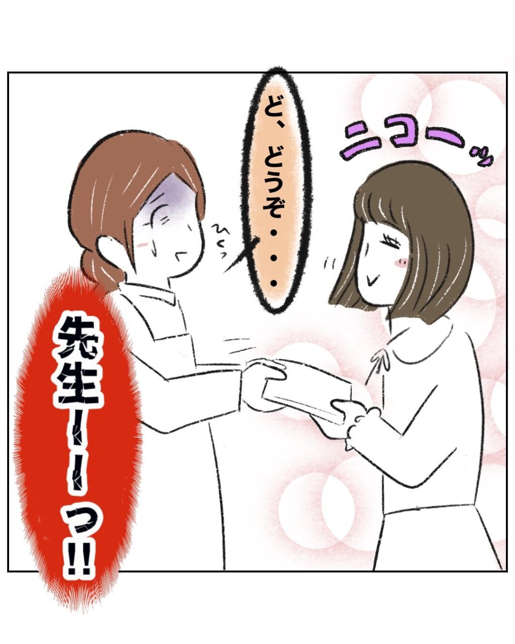 「ど、どうぞ・・」ビックリしすぎて、ゆかちゃんママに言われるまま、絵本を差し出してしまう先生に、「先生ーーっ!!」と心の中で叫ぶまるさん。