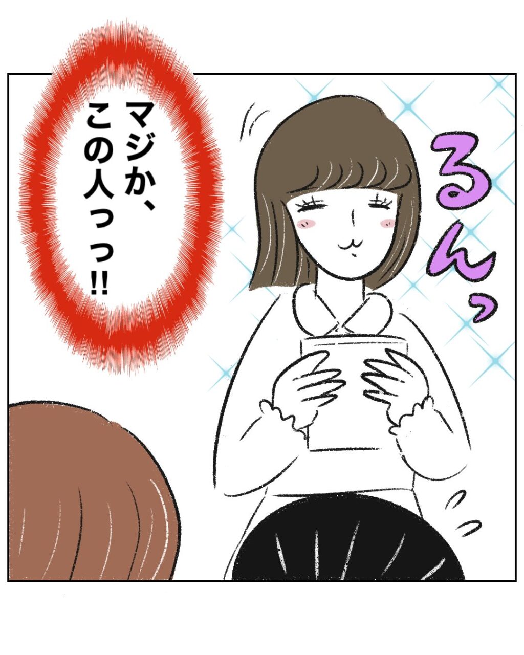 るんるんの笑顔で絵本を抱きしめるゆかちゃんママを見て、「マジか、この人っっ!!」とまるさんが恐怖を感じていると、
