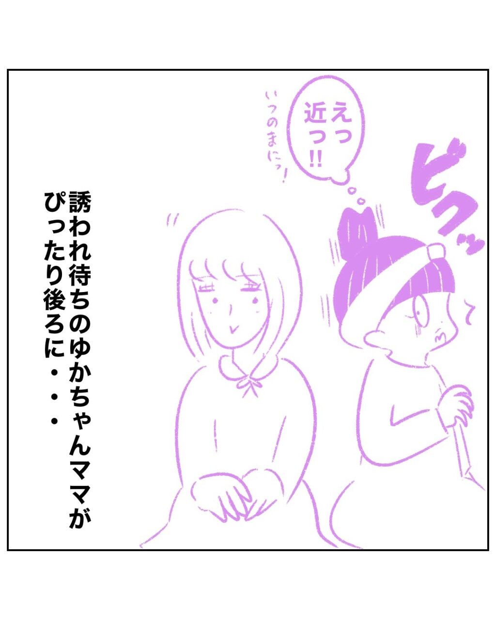 半ば強引に児童館の先生から絵本を奪い、「うれCー!ありがとうございました!」とゆかちゃんママに笑顔で言われ、「うれCーじゃねぇ!!」と心の中で毒づくまるさん。すると、「たっくんとゆーちゃん来たよー!」と気を逸らすよう、ママ友が来たと声をかけてくれたマキちゃんママ。「今度たこパしよーよ」と楽しそうにママ友達と話すまるさん達のやりとりに聞き耳を立てるゆかちゃんママは、おもむろに座り込んだかと思うと、いつの間にかまるさん達の近くに。あまりの近さに驚き、「誘われ待ちしてるぅうううう!!」とまるさんはビクビク!