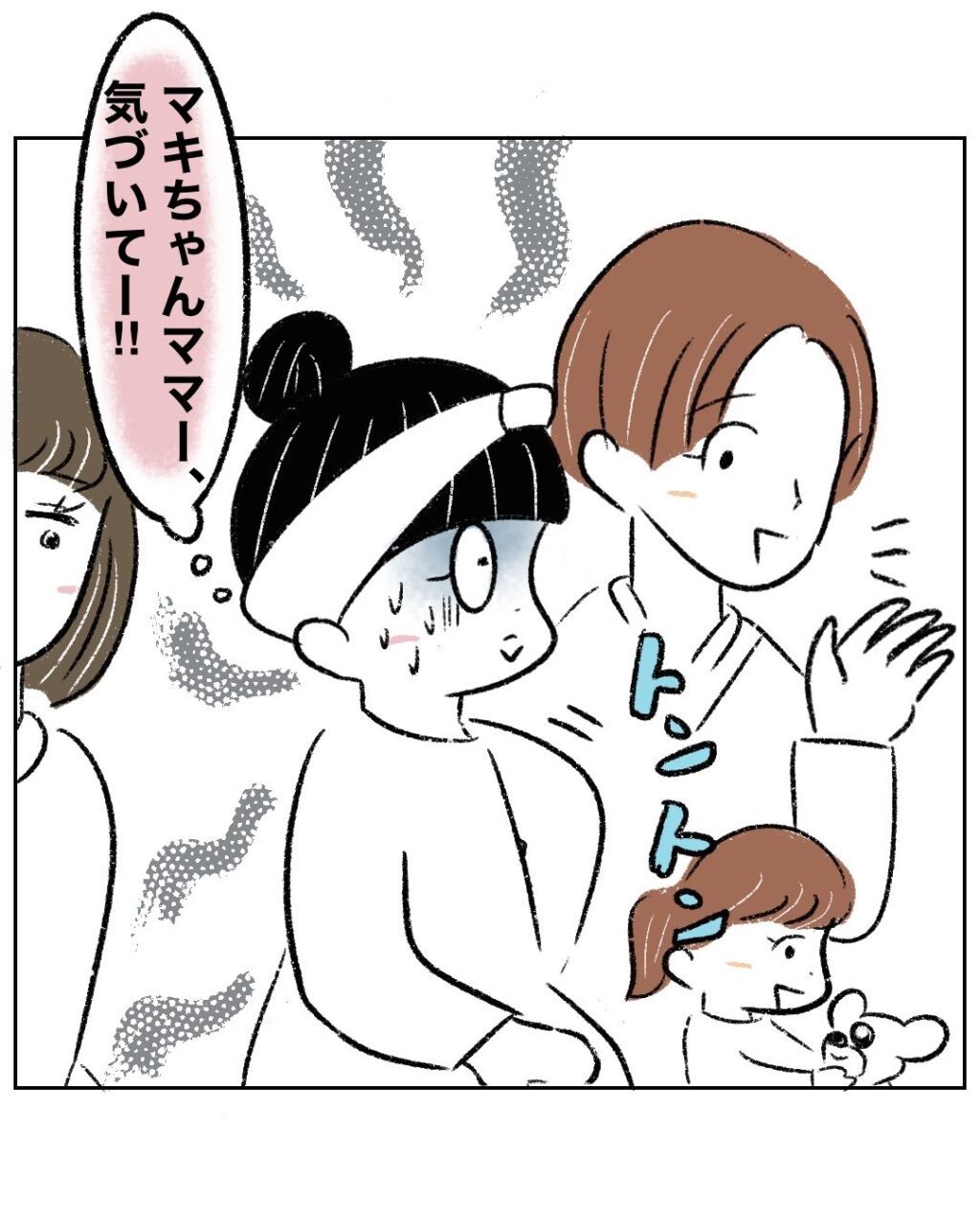 あまりの恐怖から、「マキちゃんママー、気づいてー!!」としゃべっているマキちゃんママの腕をトントン。必死に知らせようとするまるさん。