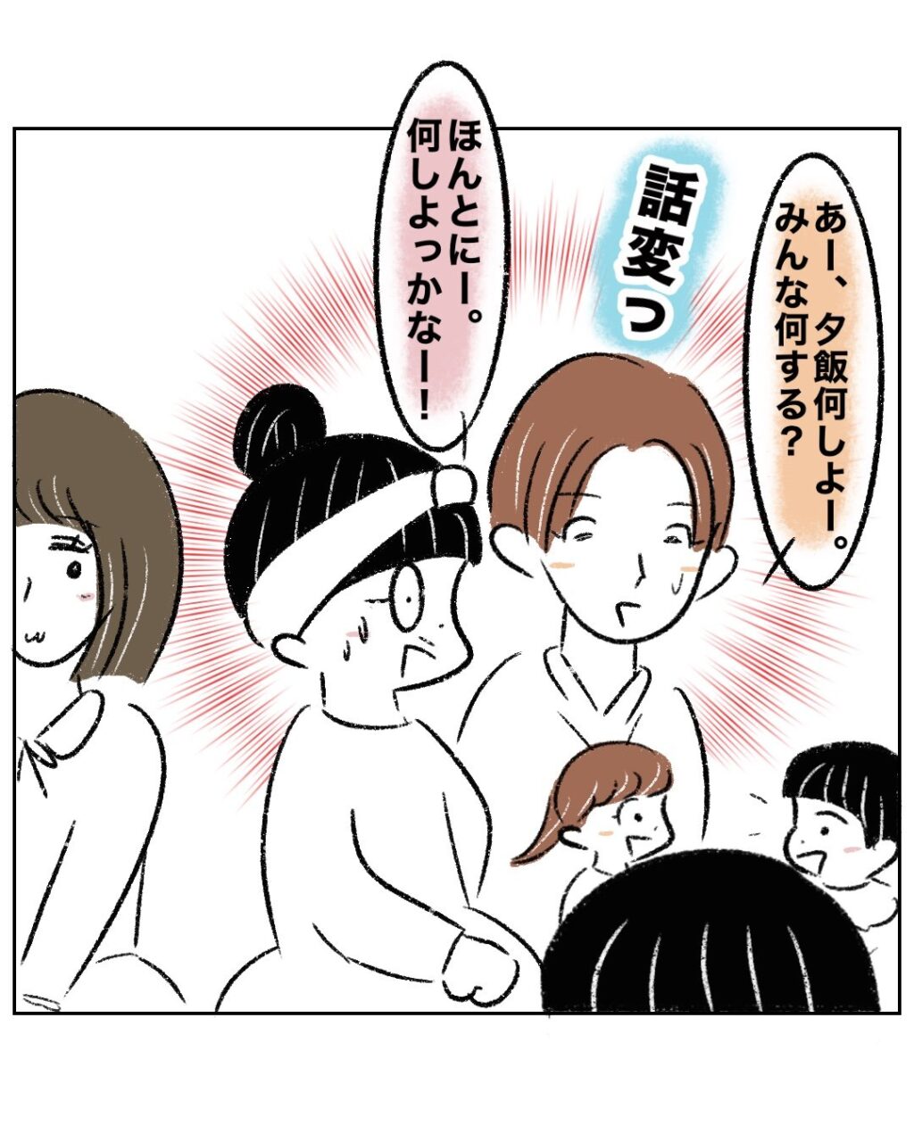 そして、「あー、夕飯何しよー。みんな何する?」とサッと話を切り替えるマキちゃんママ。それに乗って「ほんとにー。何しよっかなー!」と言うまるさん。二人はたこパ話をしないよう、日常の話で盛り上がりました。