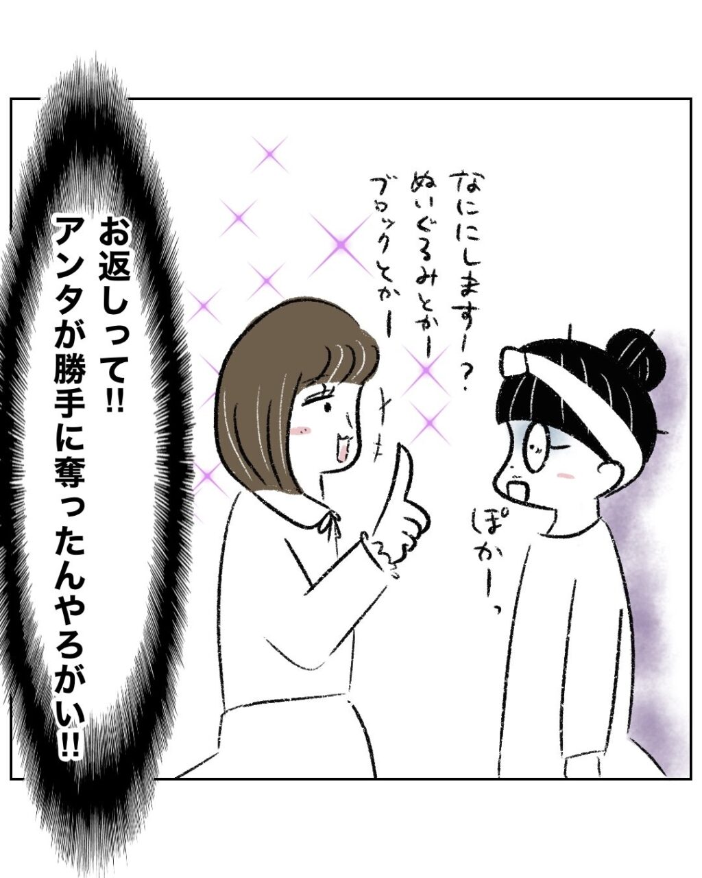 さらに、「なににしますー?ぬいぐるみとかー、ブロックとかー・・」とペラペラしゃべり出すゆかちゃんママに、「お返しって!!アンタが勝手に奪ったんやろがい!!」と心の中で呟きながら、ぽかんとしてしまいました。