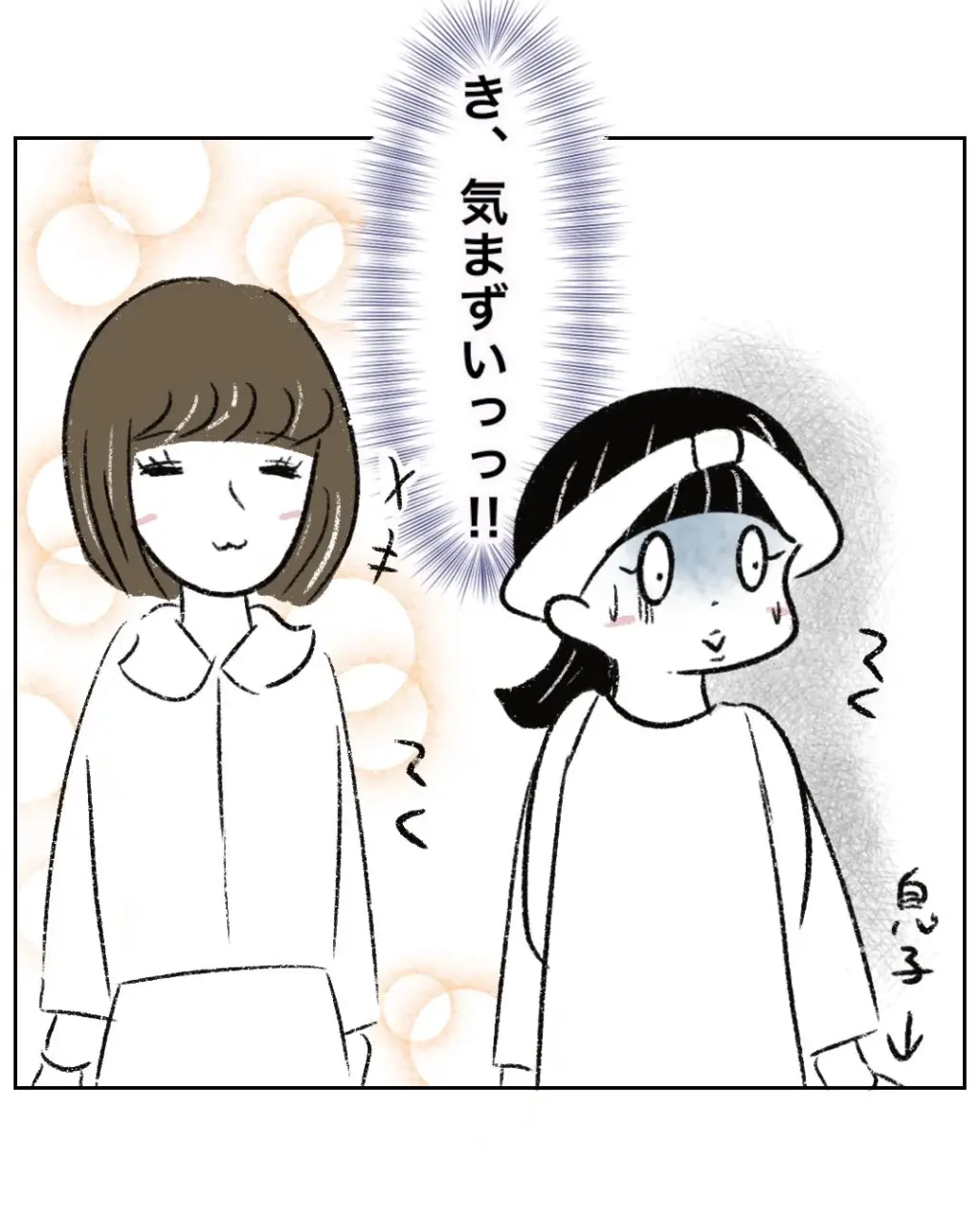 スーパーに向って歩くまるさんは「き、気まずいっ!!」と落ち着かない気持ちでいっぱいになるも、ゆかちゃんママはにこにこ笑いながら、