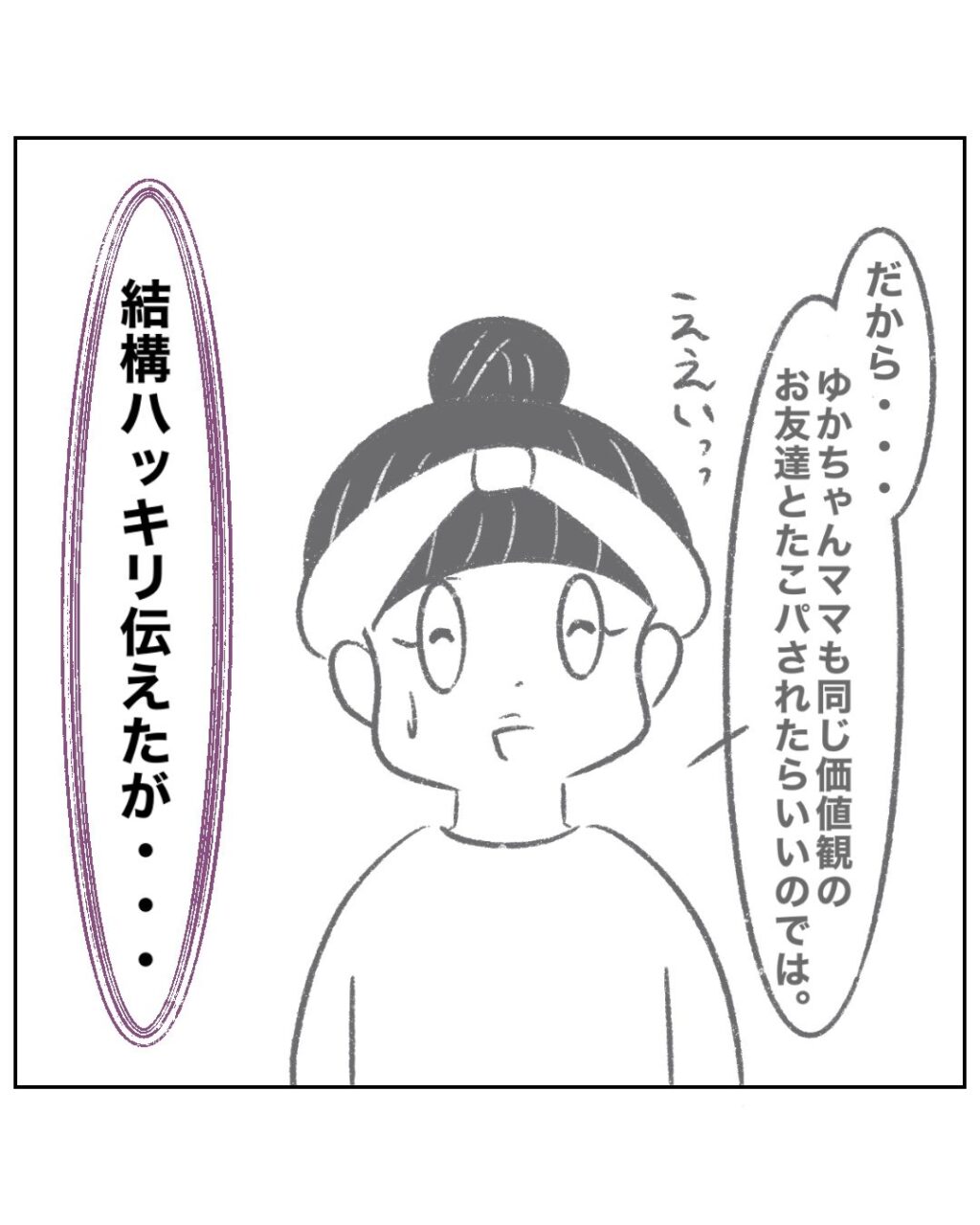 たこパに誘ってもいないのに参加すると言った挙句、食材を指定し、持参すると言うゆかちゃんママに、我慢の限界だったまるさんは、「ゆかちゃんママも同じ価値観のお友だちとたこパされたらいいのでは?」とはっきり言ったところ、