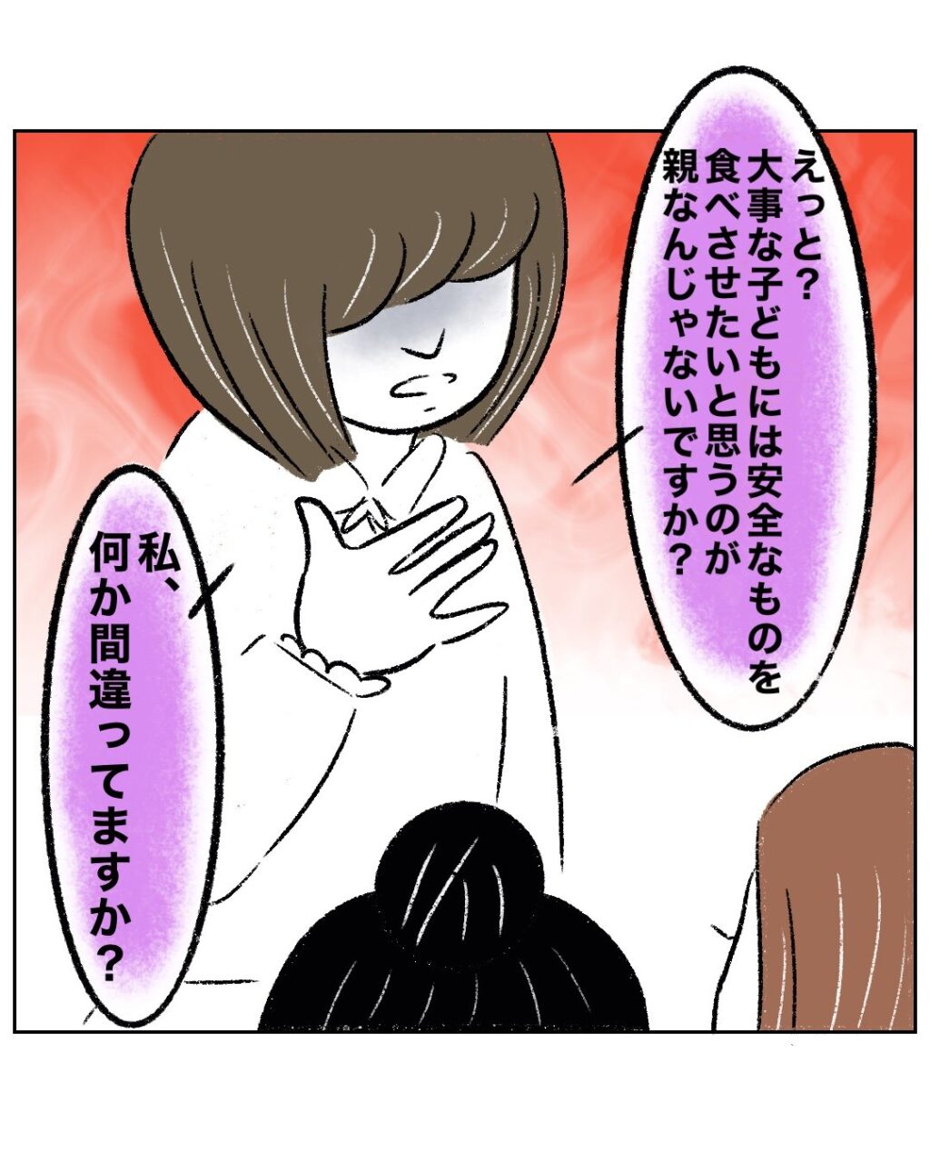 「えっと?大事な子どもには安全なものを食べさせたいと思うのが親なんじゃないですか?私、何か間違ってますか?」と言い出すゆかちゃんママに、