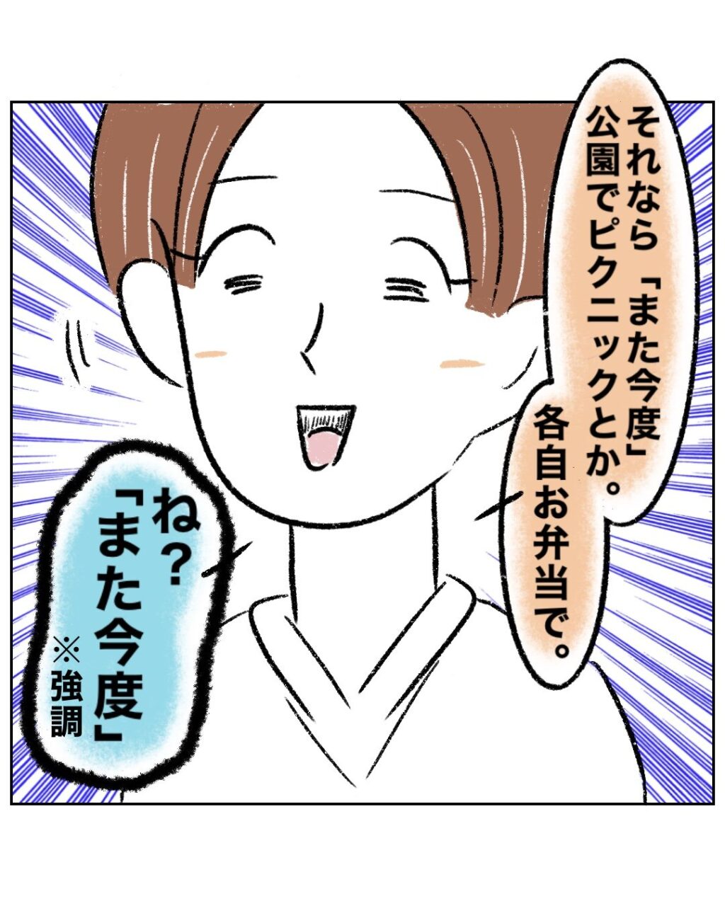 「それなら『また今度』公園でピクニックとか。各自お弁当で。ね?『また今度』」とさらに協調してそう言うと、