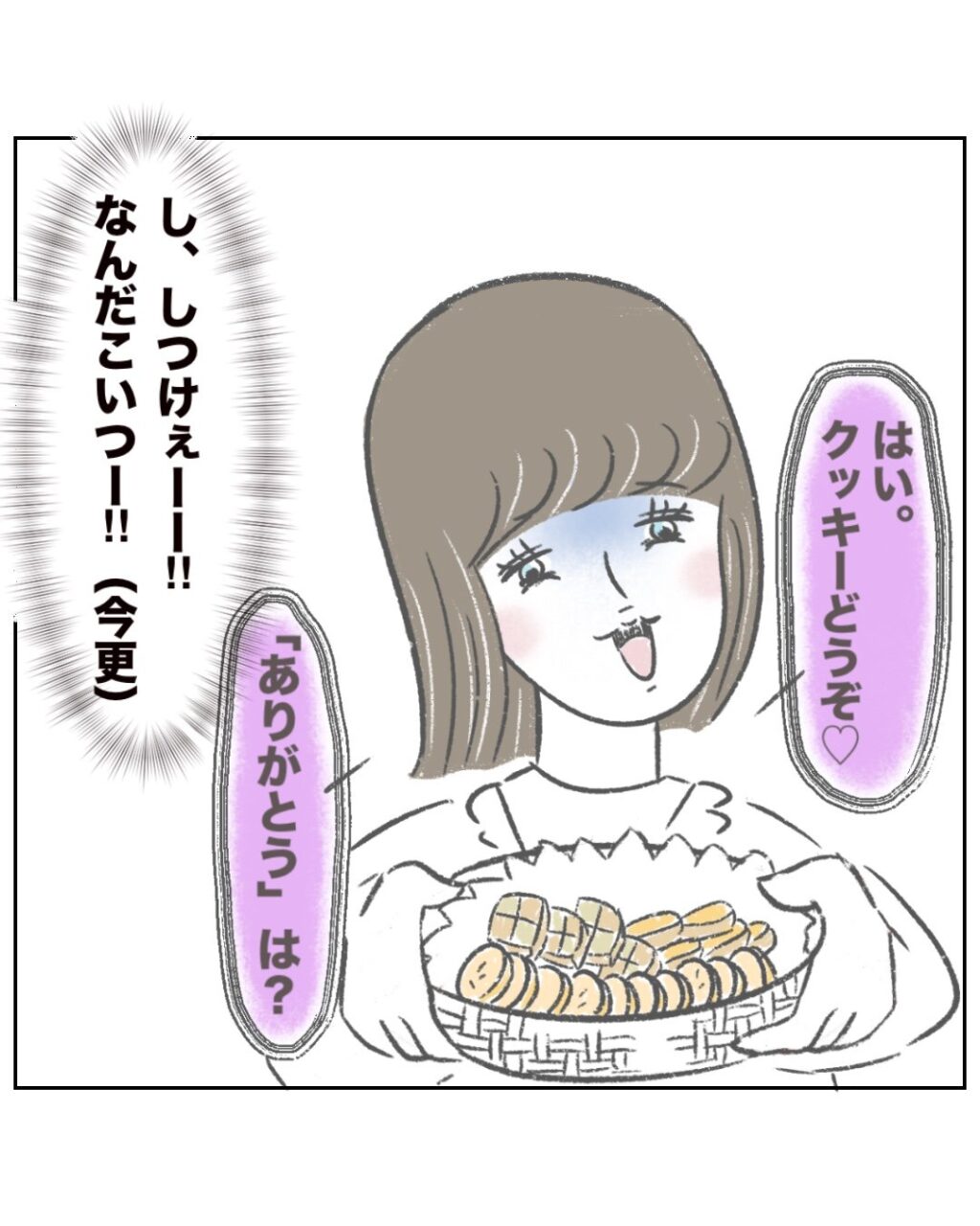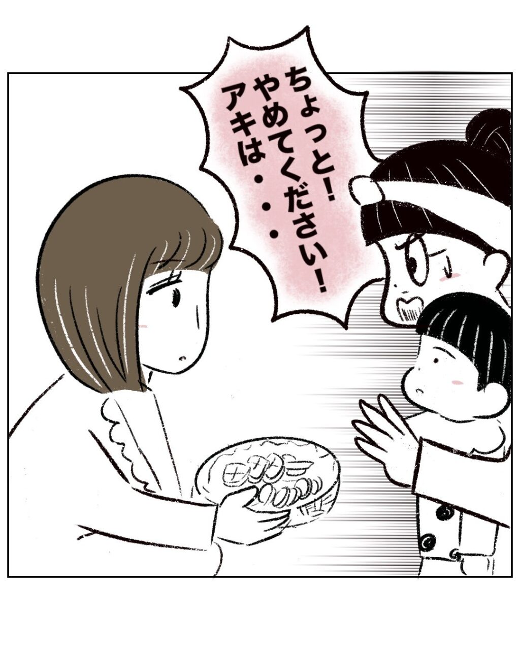 アキくんが「いらない」と言っているのに、手作りのローズマリーとダージリンのクッキーを強引に勧めて食べさせようとするゆかちゃんママ。まるさんが「やめてください!」と強めに断りますが、ゆかちゃんママは「アキくん、ちくちく言葉とふわふわ言葉を知れてよかったですね」と的外れな返答。頭に来たまるさんは「息子が好まないものは無理に食べさせたくありません。アキは甘いものが好きではないのでいりません!」ともう一度きっぱりと断りました。するとゆかちゃんママは、ローズマリーとダージリンは脳の活性化や集中力向上が期待できる、とまたしても的外れな答えをケロリと言いました。