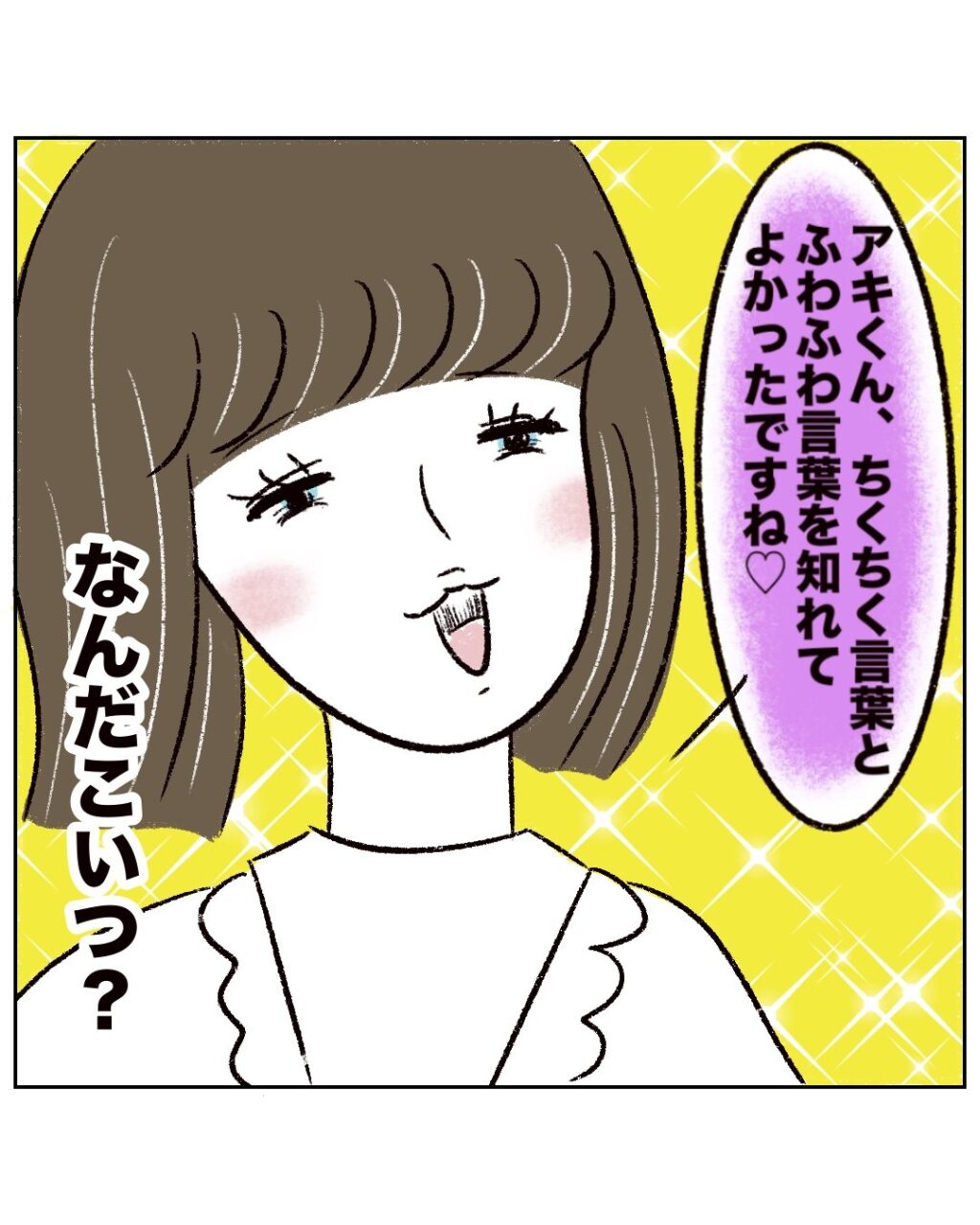 ゆかちゃんママは「アキくん、ちくちく言葉とふわふわ言葉を知れてよかったですね」とにっこり。話の噛み合わないゆかちゃんママにまるさんは「なんだこいつ?」と思い、