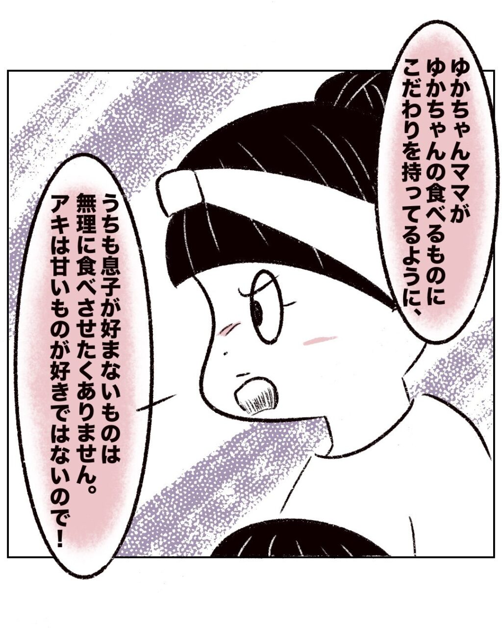 「ゆかちゃんママがゆかちゃんの食べるものにこだわりを持ってるように、うちも息子が好まないものは無理に食べさせたくありません。アキは甘いものが好きではないので!」と怒りを滲ませながらはっきり伝え、