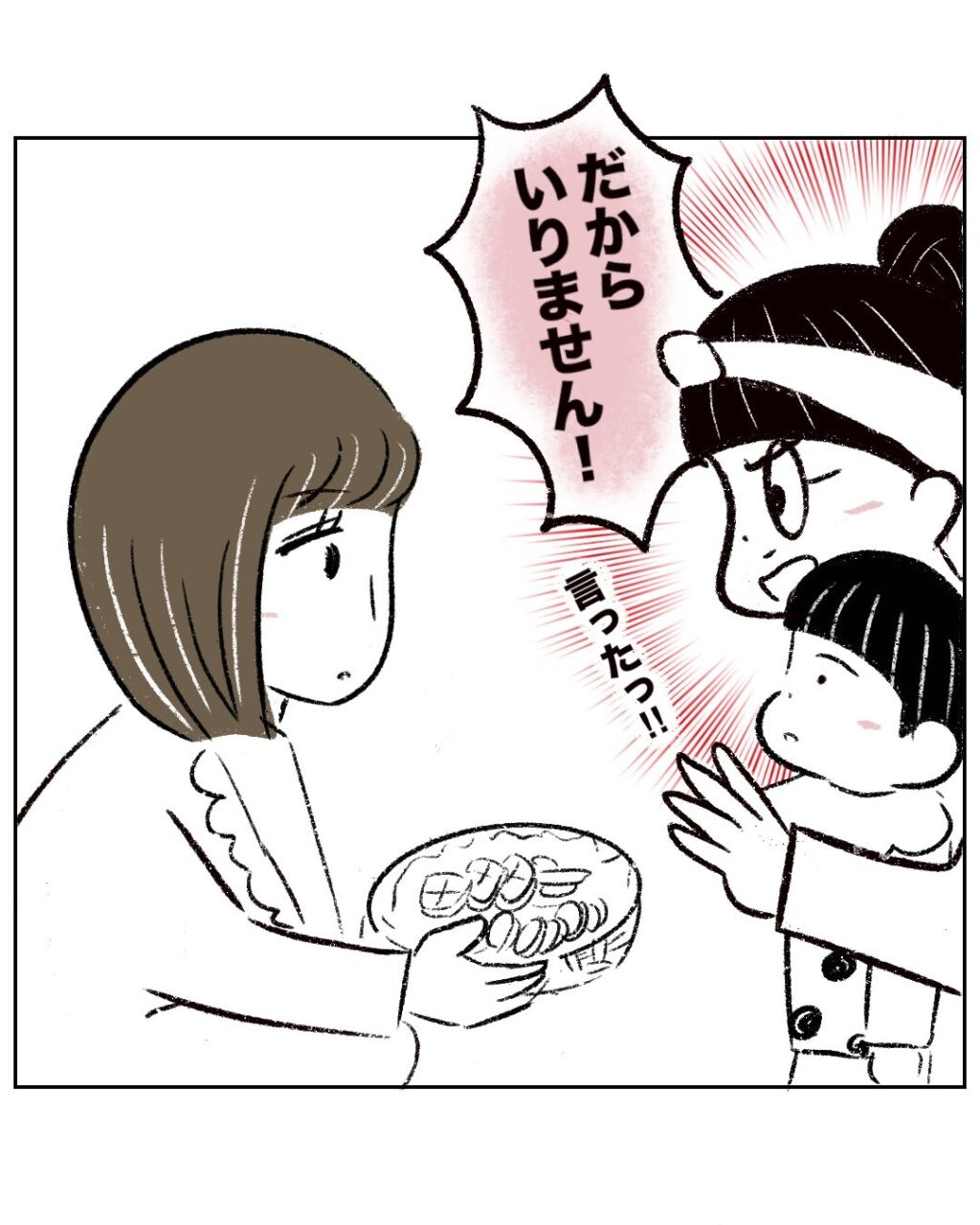 「だからいりません!」と手作りクッキーを強引にアキくんに勧めるゆかちゃんママにきっぱりと断ったまるさん。