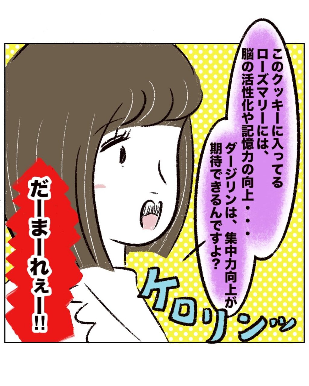 すぐに「このクッキーに入ってるローズマリーには、脳の活性化や記憶力の向上・・ダージリンには、集中力向上が期待できるんですよ?」とケロリとして言いました。話の通じないゆかちゃんママにまるさんは「だーまーれぇー!!」と心の中で叫びます。