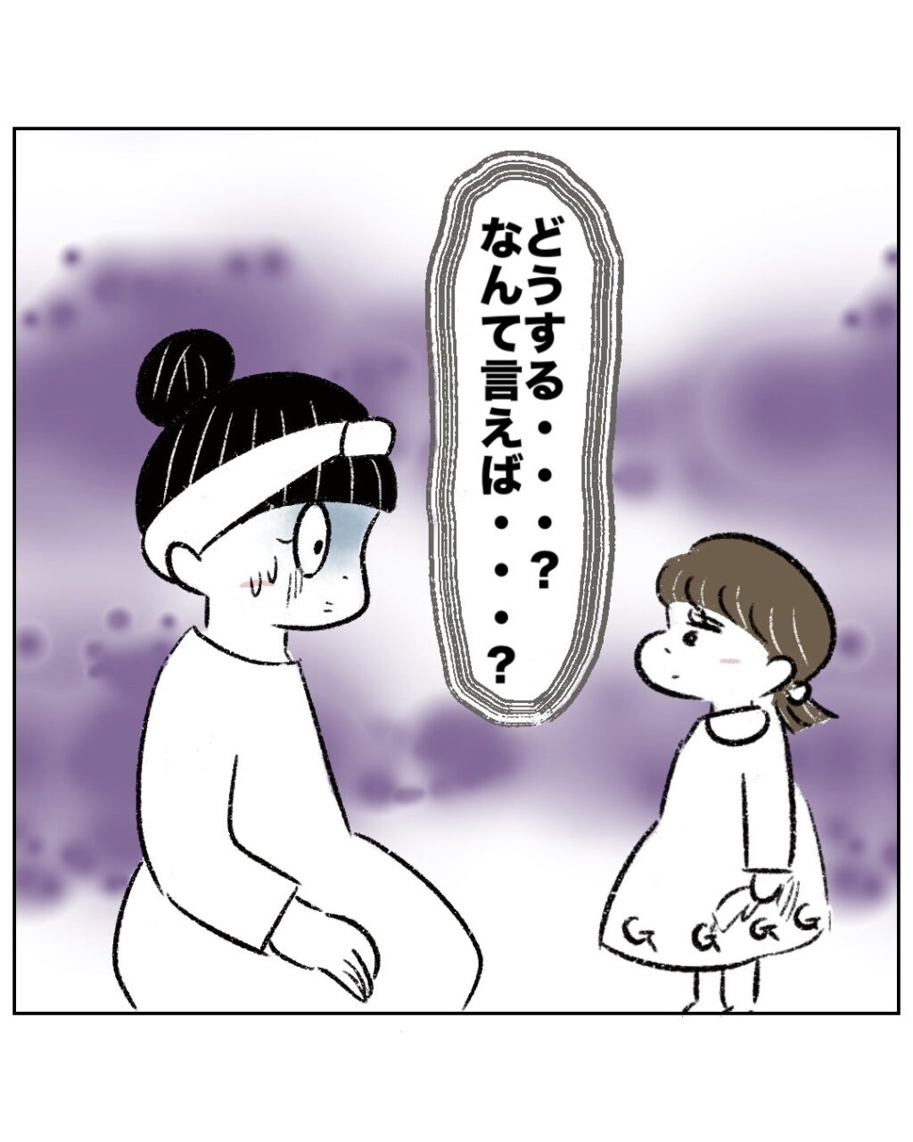 まっすぐまるさんの目を見て訴えてくるゆかちゃんに「どうする・・?なんて言えば・・?」と困ってしまうまるさん。