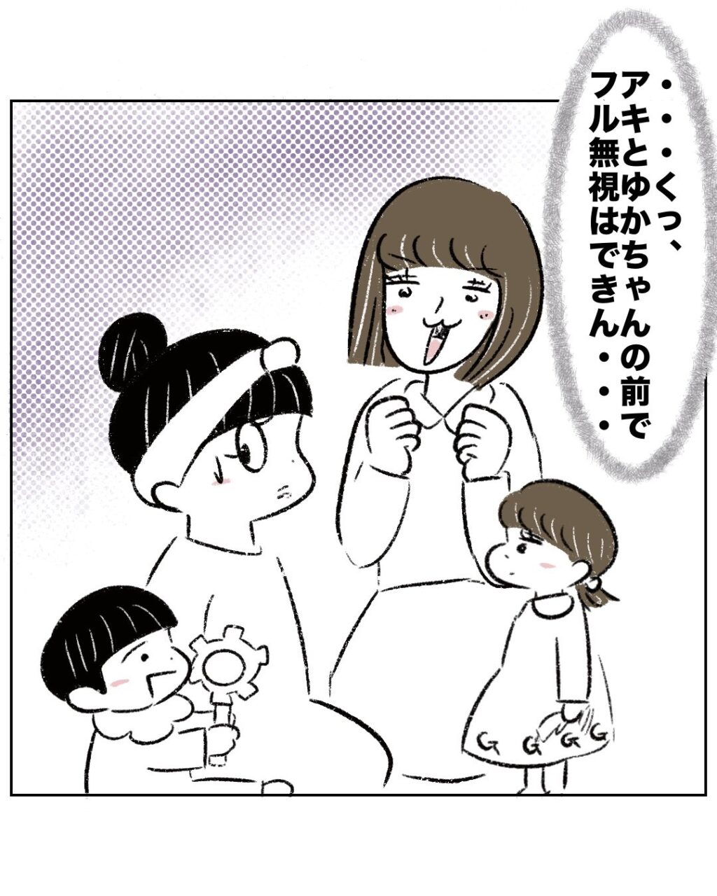 「・・くっ、アキとゆかちゃんの前でフル無視はできん・・」と、子ども達の前でゆかちゃんママを無視するのはよくないと判断したまるさん。