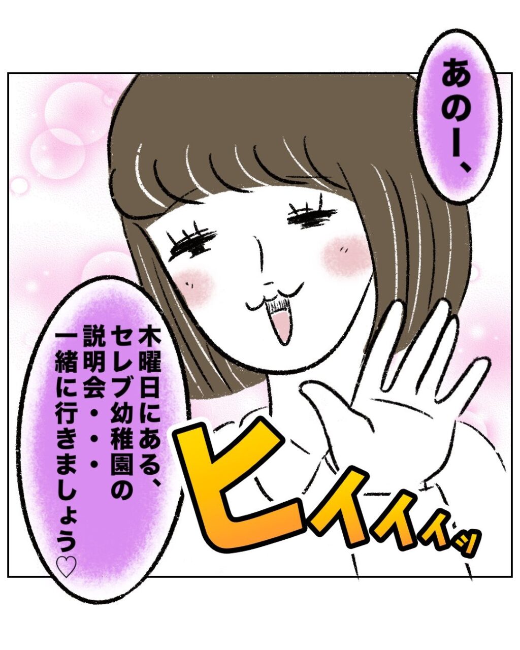 すると、まるさんが無視できないと判断したゆかちゃんママは「あのー、木曜日にある、セレブ幼稚園の説明会・・一緒に行きましょう」とにっこり笑顔で誘ってきました。