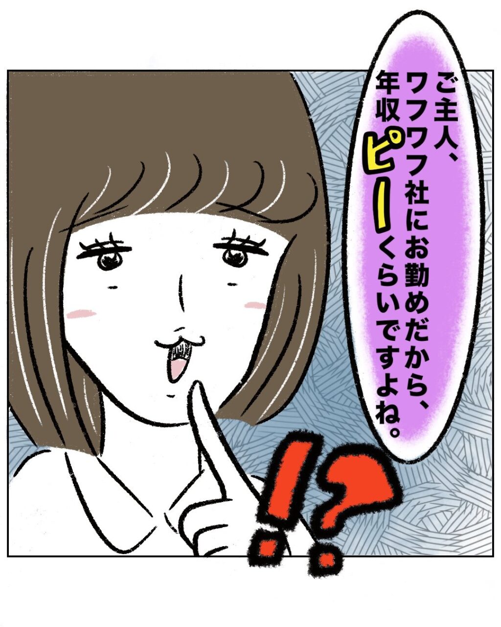 すると、ゆかちゃんママは悪びれることなく「ご主人、ワフワフ社にお勤めだから、年収(ピー)くらいですよね」と一言。