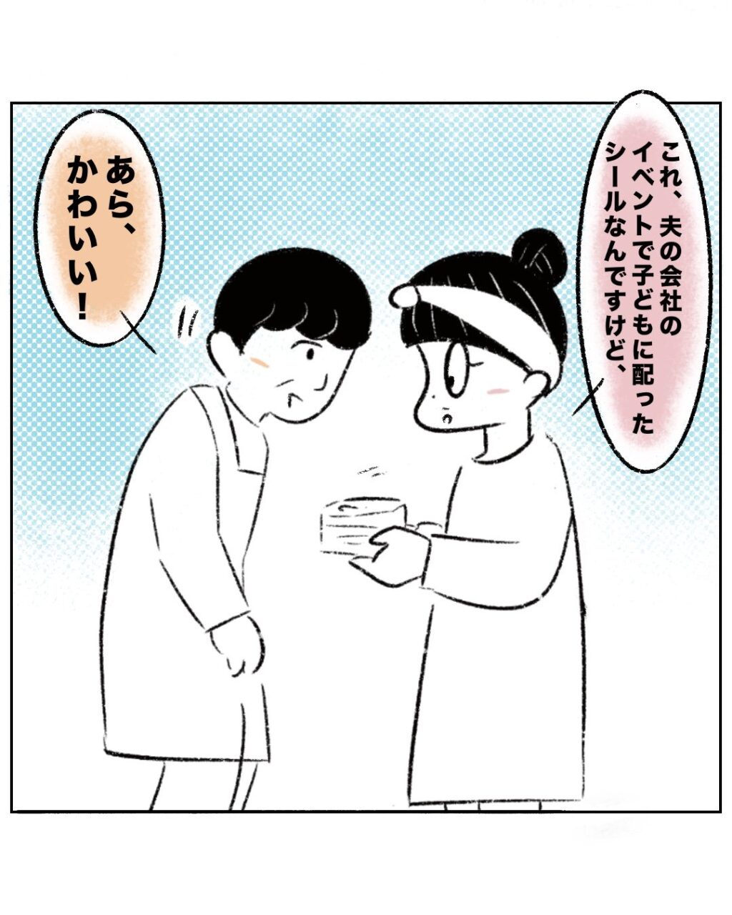 実は数日前、まるさんは児童館で先生とこんなやり取りをしていました。「これ、夫の会社のイベントで子どもに配ったシールなんですけど・・」とまるさんがたくさんのシールを先生に見せると、「あら、かわいい!」と笑顔になる先生。