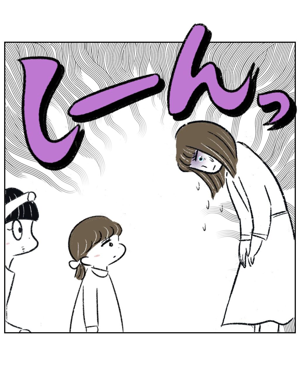 気まずそうに頭を下げ続けるママをゆかちゃんは無言でじっと見つめます。