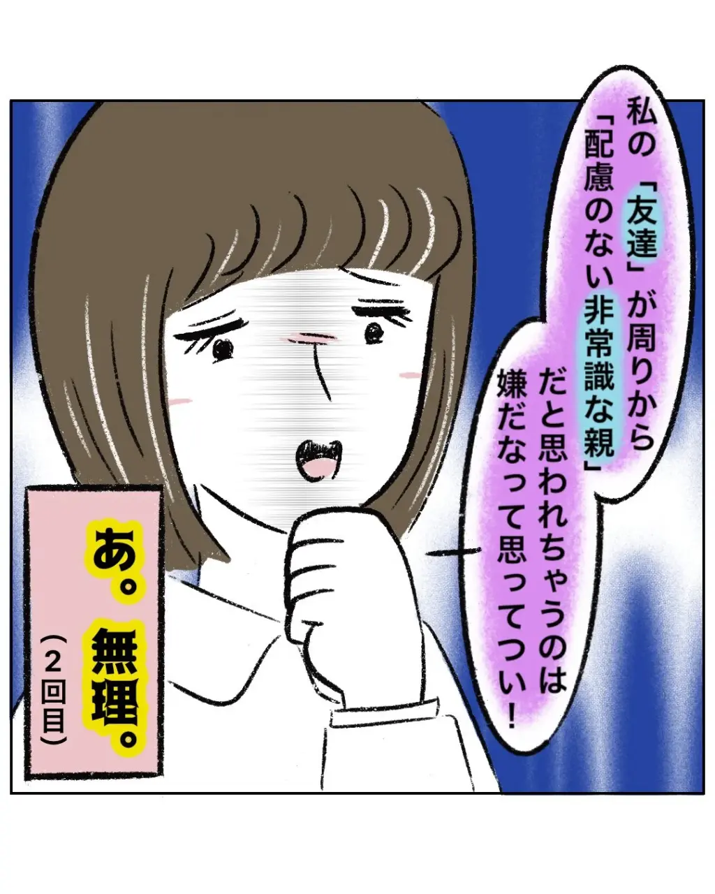 「私の『友達』がまわりから『配慮のない非常識な親』だと思われちゃうのは嫌だなって思ってつい!」と遠回しにまるさんのことを否定するゆかちゃんママ。まるさんはさっきよりも強く「あ。無理」と感じました。