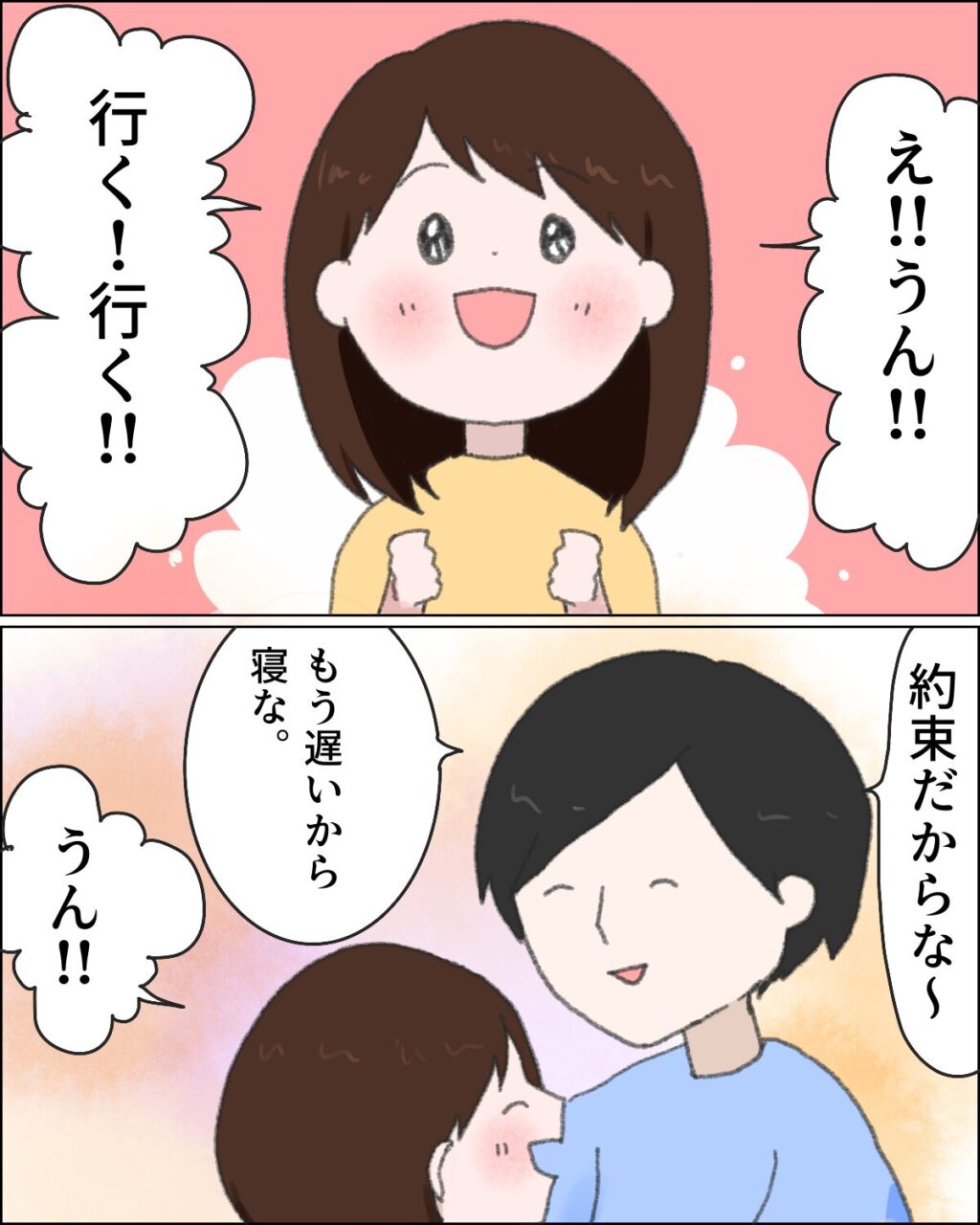 「え!!うん!!行く!行く!!」と目を輝かせるユリに、「約束だからな~。もう遅いから寝な」と夫が言うと、「うん!!」と嬉しそうにユリが返事をしました。