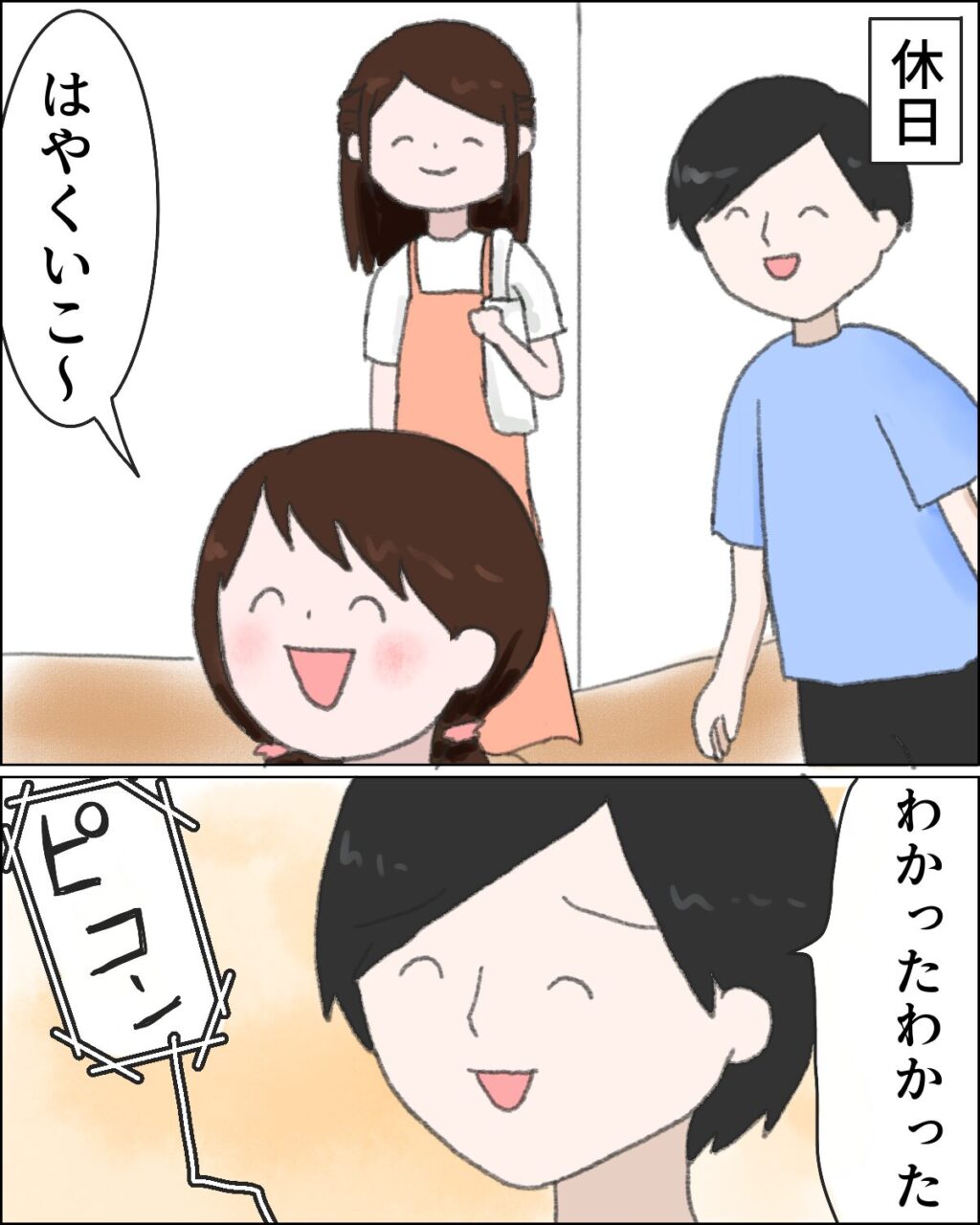 休日になり、「はやくいこ~」とワクワクしているユリを微笑ましい気持ちで見つめていました。「わかったわかった」と言う夫のスマホがピコンと鳴ったかと思うと、