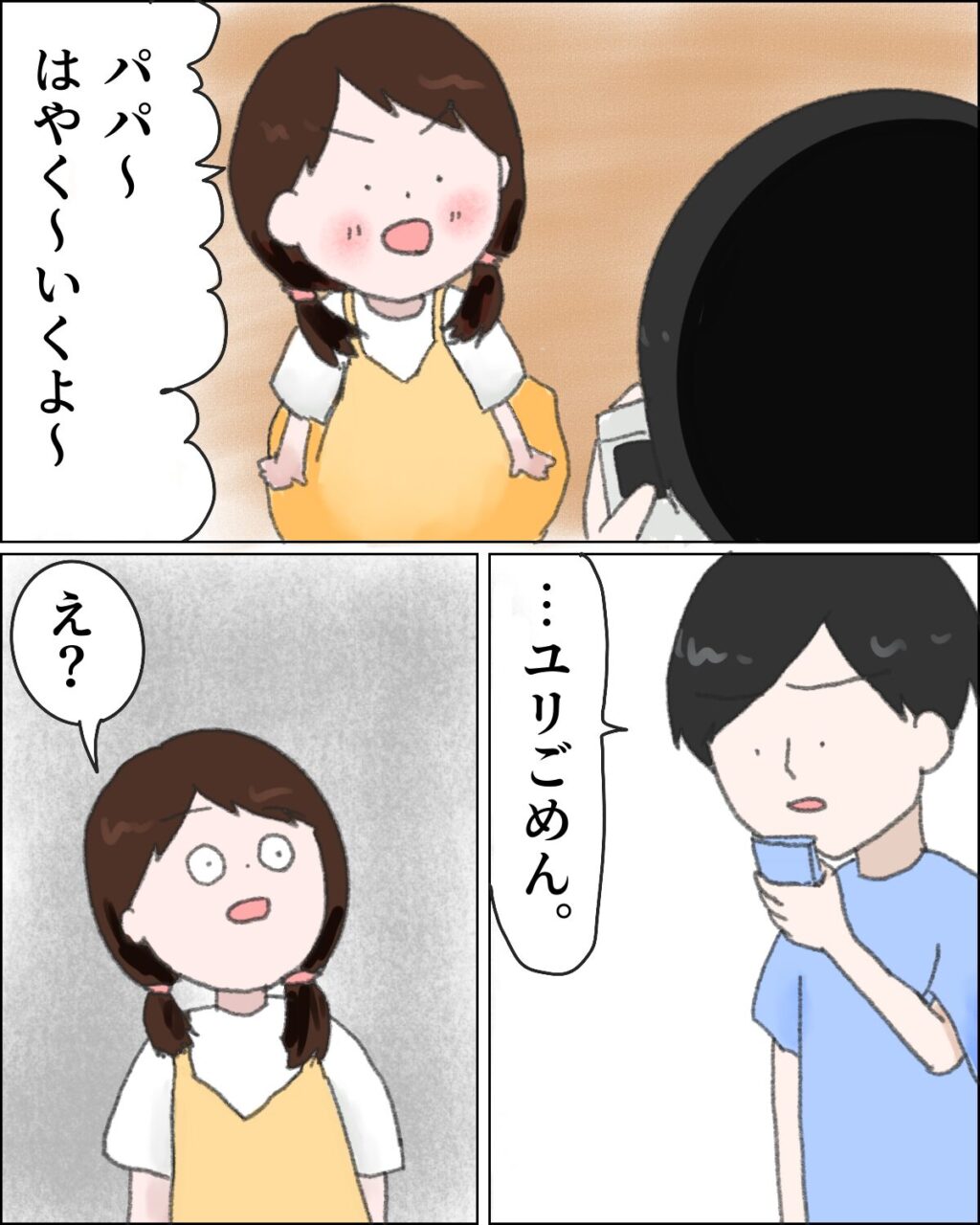 「パパ~はやく~。いくよ~」とテンションアゲアゲのユリが言うと、「・・ユリごめん」と謝る夫。「え?」ユリは訳がわからない様子でした。